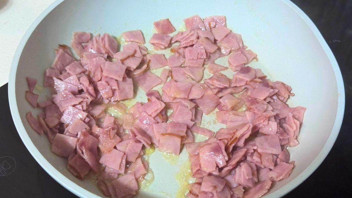Añade la mantequilla en otra sartén y, cuando se derrita, añade el jamóny cocínala hasta que esté dorada.