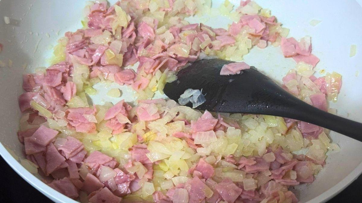 Agrega el jamón junto con la cebolla y sofríe un par de minutos, verifica la sazón, retira del fuego y deja enfriar ligeramente.