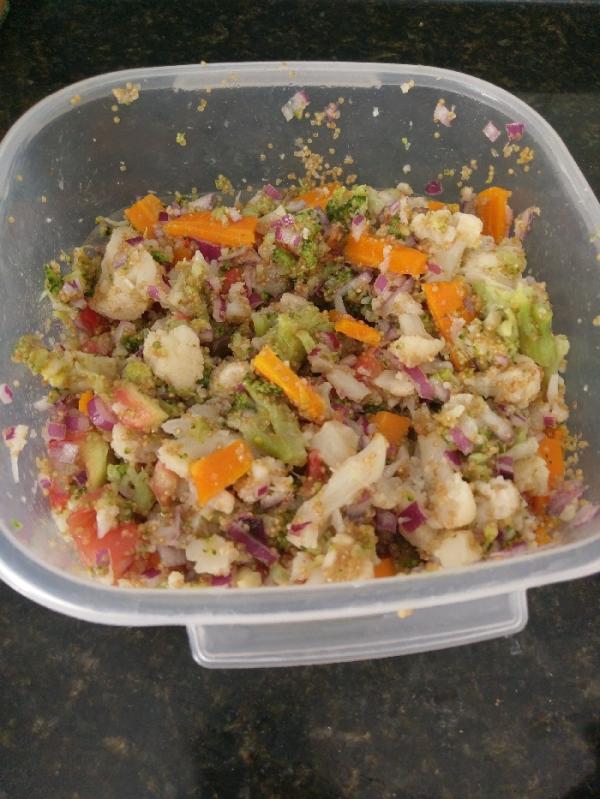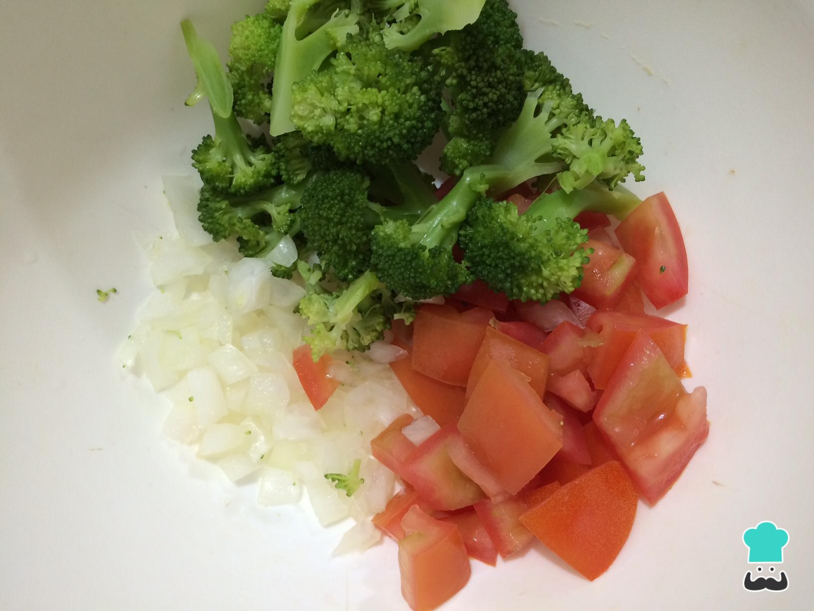 Para empezar a armar el plato, en un bol mezclar muy bien la cebolla cortada finamente, el tomate sin semillas cortado en cubos y el brócoli cortado en rodajas.