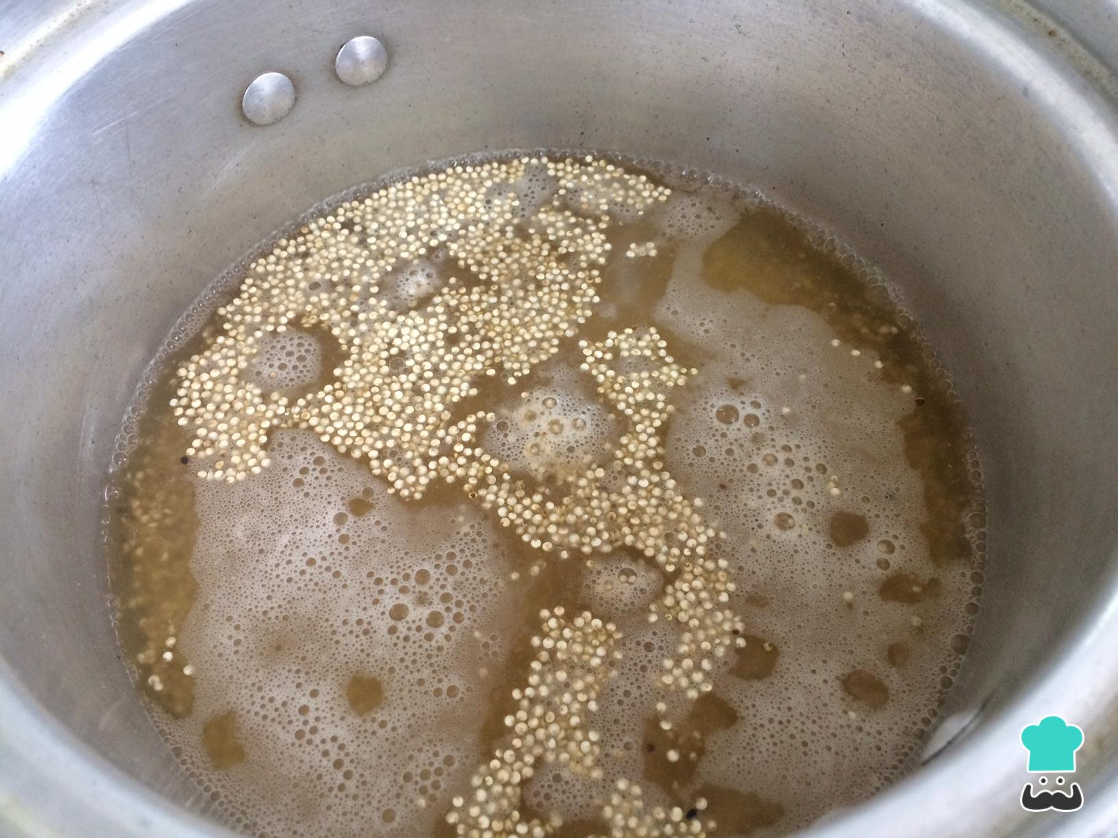 En una olla, con una taza y media de agua hirviendo, cocinar la quinoa con una pizca de sal hasta que el grano abra y el agua evapore. Este proceso debe ocupar al menos unos 20 minutos.