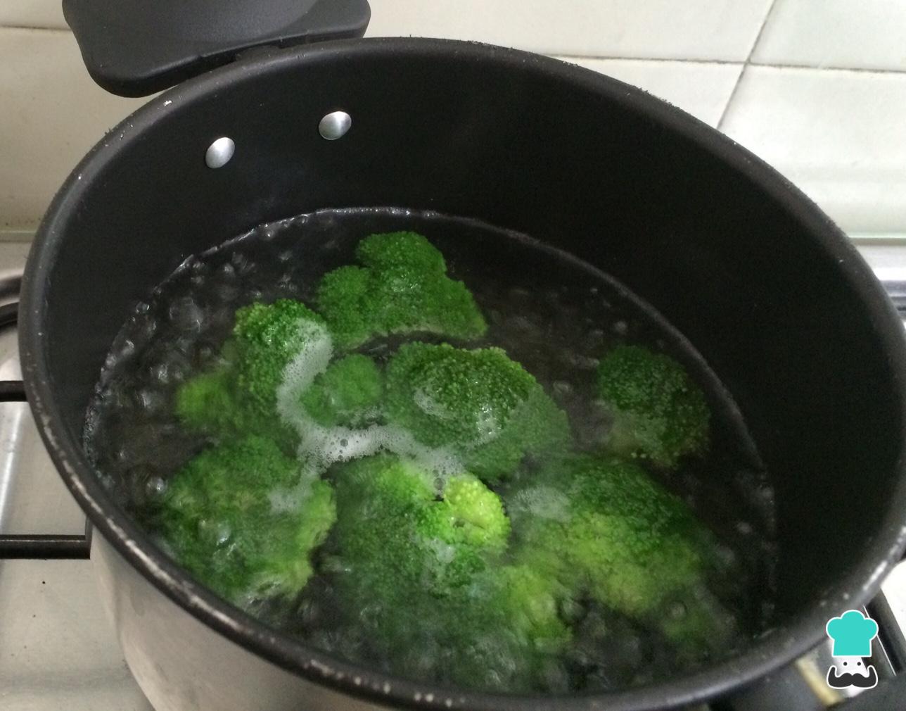 Aparte, en una olla con agua hirviendo y sal, agregar los arbolitos de brócoli y cocinar a fuego medio durante 10 minutos, escurrir y reservar.