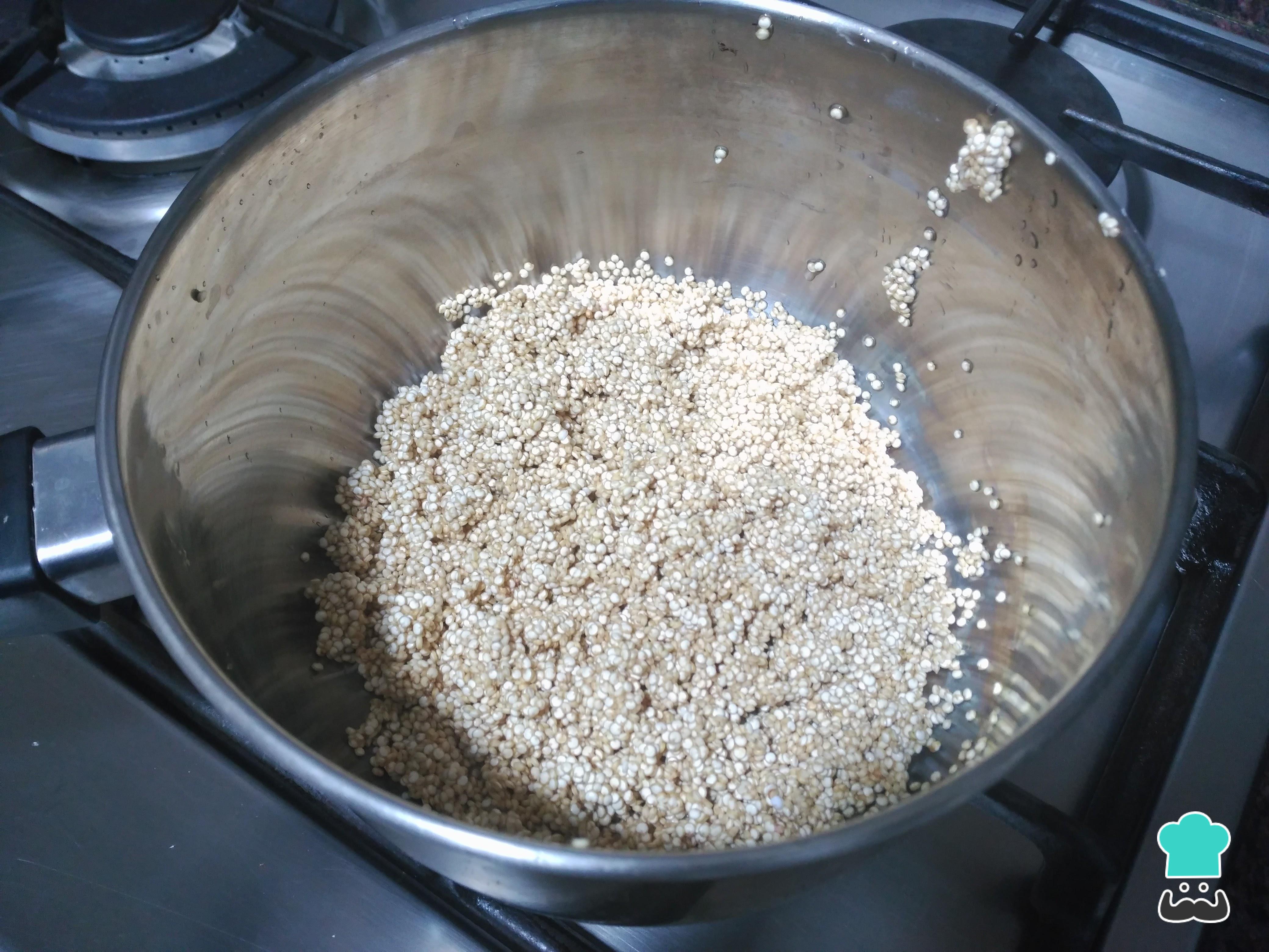 Una vez bien limpia, coloca la quinoa en una olla a fuego lento y sécala durante un minuto aproximadamente.