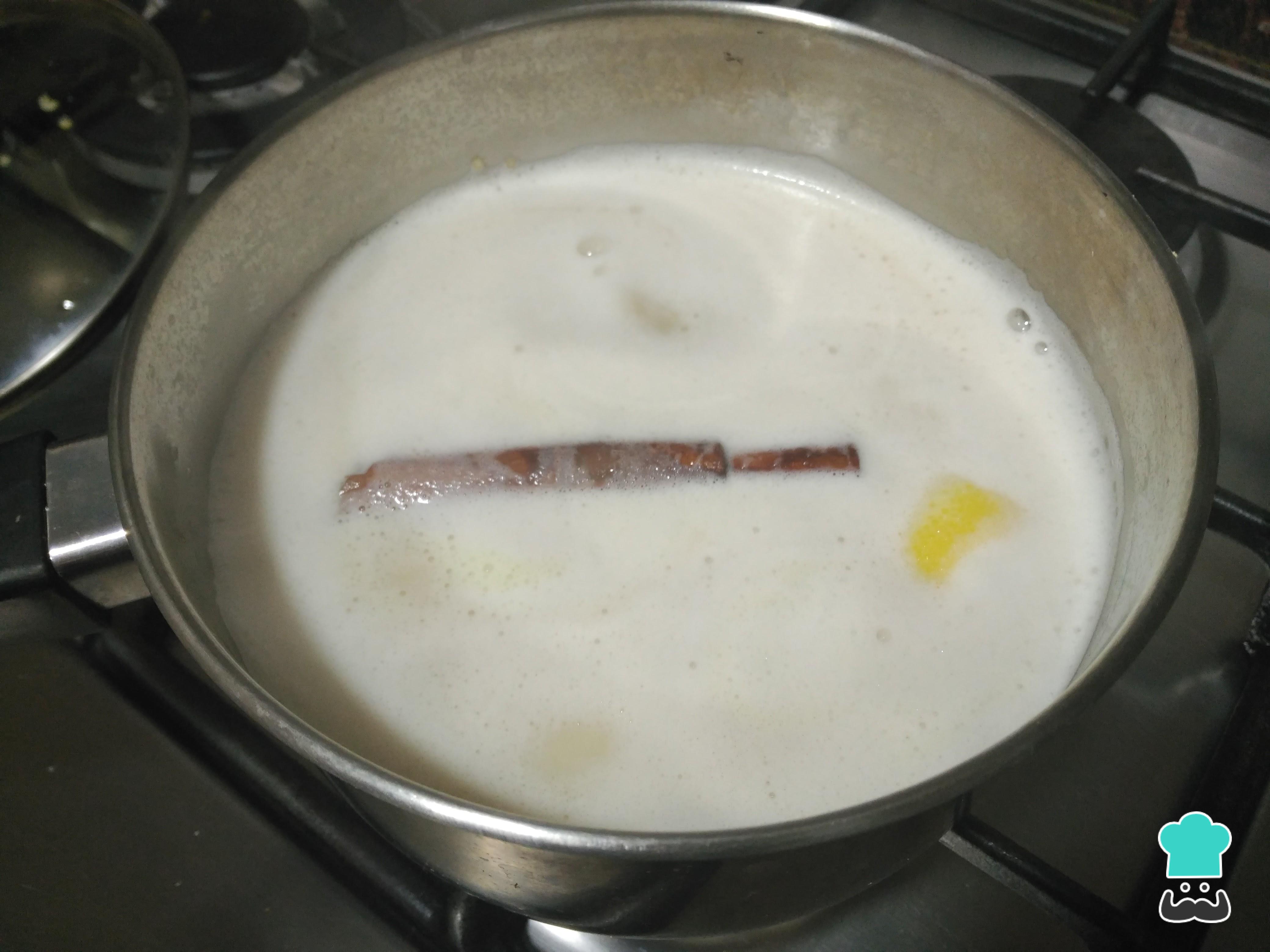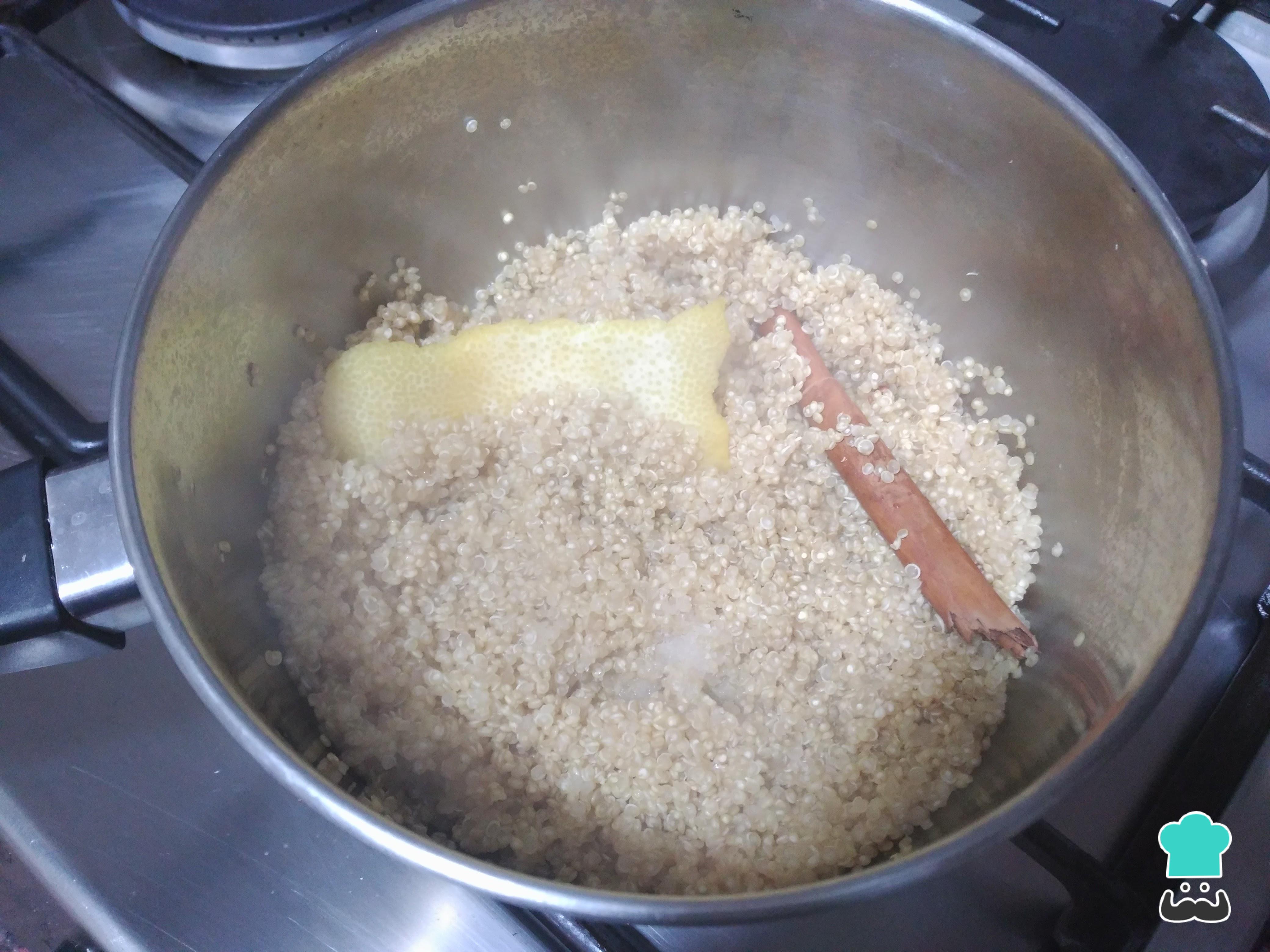 En principio la quinoa ya estaría cocida y podríamos utilizarla perfectamente así para cualquier plato, pero como queremos que tenga la textura de un arroz con leche tradicional, lo que haremos será cocinarla más rato para que suelte el almidón y quede melosa. Para ello primero añadimos la media rama de canela, una pizca de sal y la cáscara de limón sin la parte blanca que amarga. Removemos un minuto.