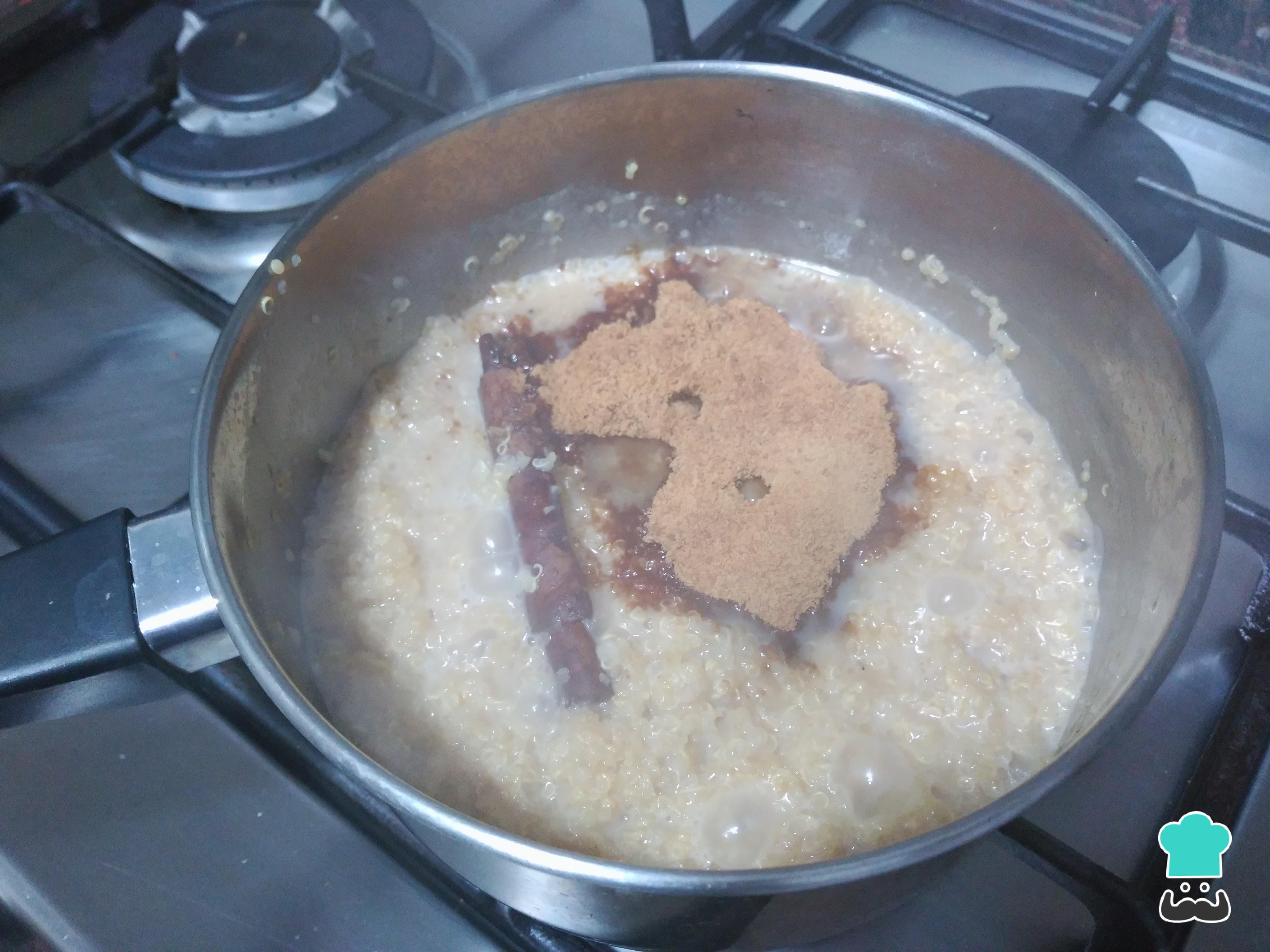 Cuando la quinoa con leche vegetal lleve unos 40 minutos hirviendo, añade el azúcar de coco, remueve todo bien, y déjalo cocinar unos 5 minutos más. Verás que en este momento el postre de quinoa con leche de coco tiene una textura más melosa y parecida al arroz con leche de toda la vida.