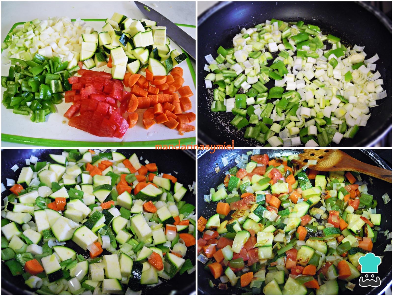 Pon una cazuela o sartén al fuego con aceite, añade el puerro y el pimiento y rehoga unos minutos. Añade la zanahoria y el calabacín y sigue rehogando. Echa el tomate y cuece todo junto unos 8 minutos. Sazona las verduras.