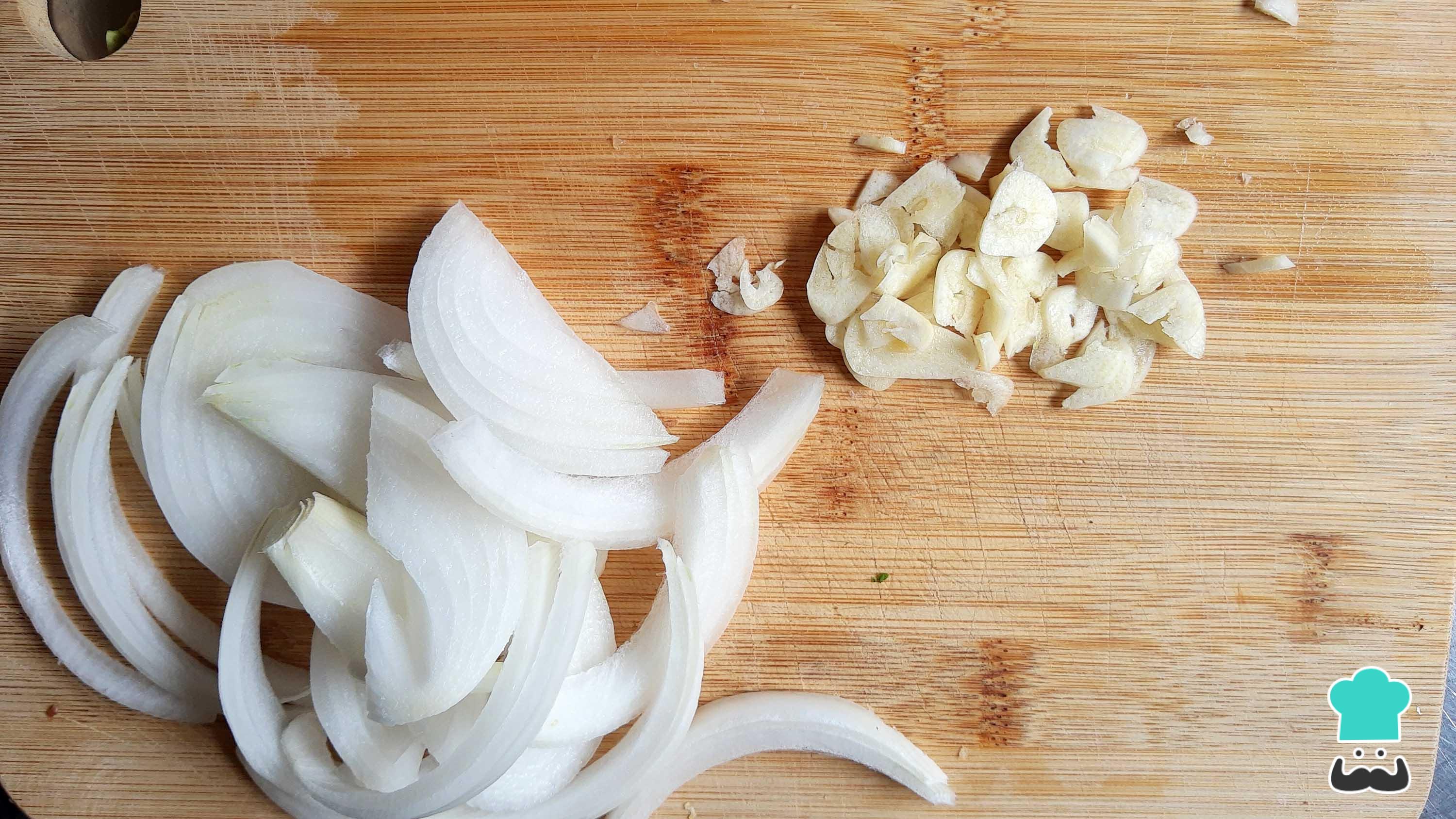Pica los dientes de ajo y la cebolla. Puedes elegir cortar el ajo en láminas o rodajas y la cebolla en plumas o también en rodajas.