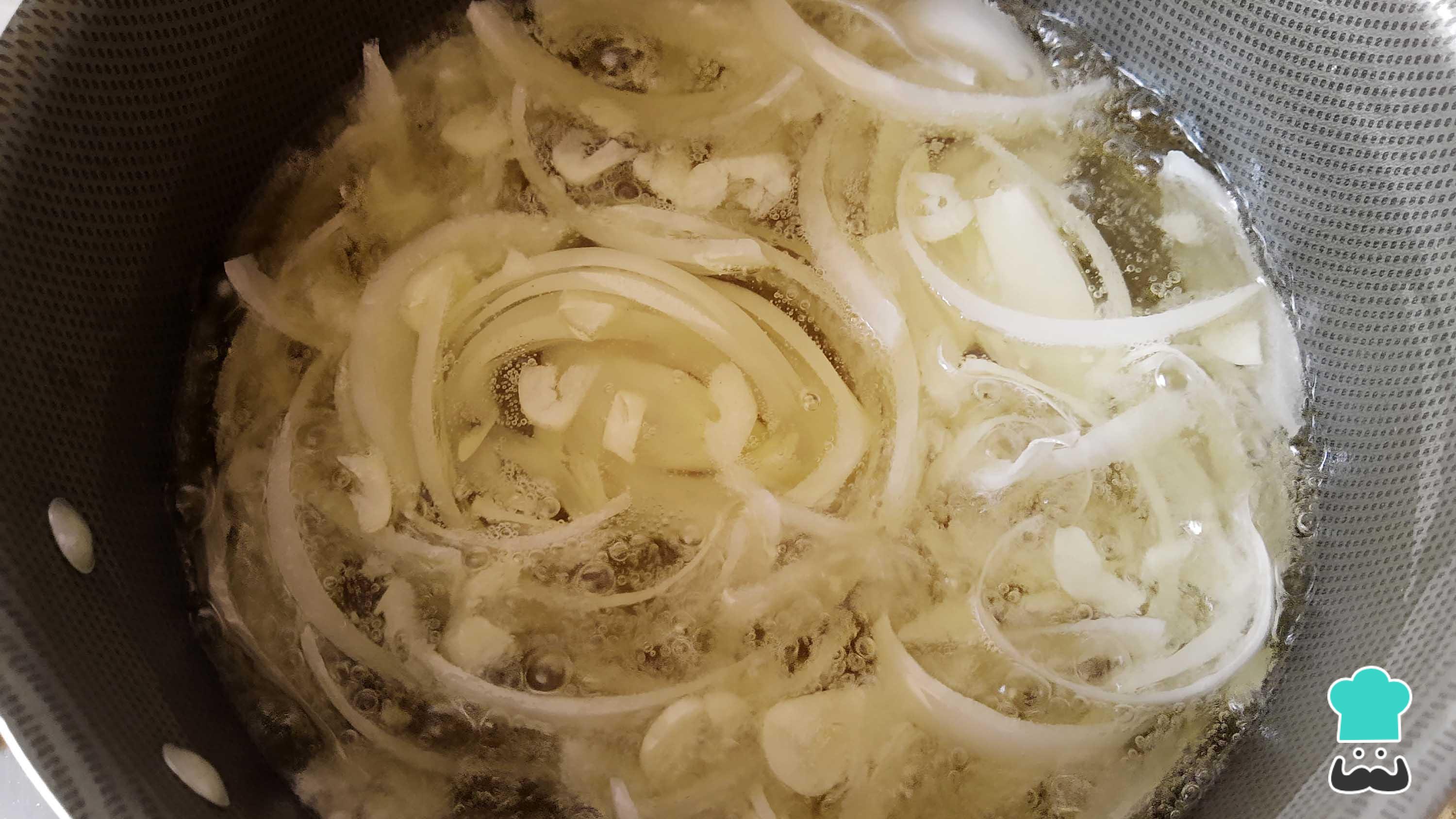 En una olla calienta una taza de aceite de oliva y cuando esté caliente agrega el ajo y la cebolla. Mezcla y cocina aproximadamente unos 5 minutos.
