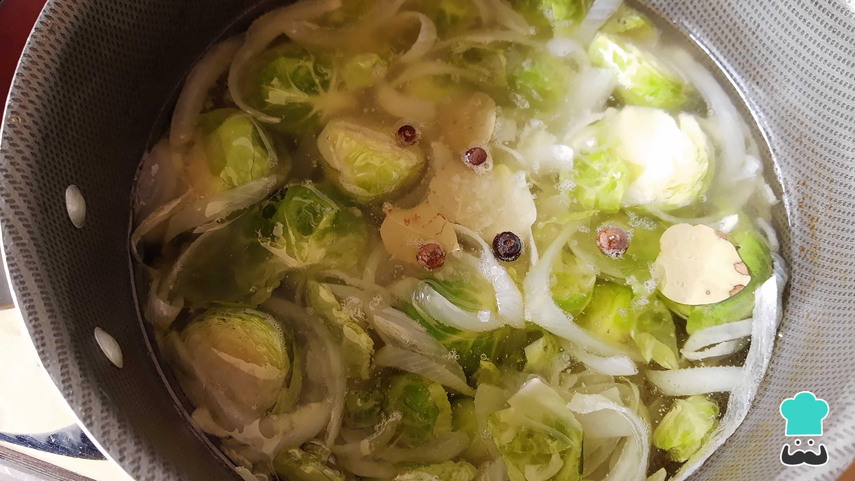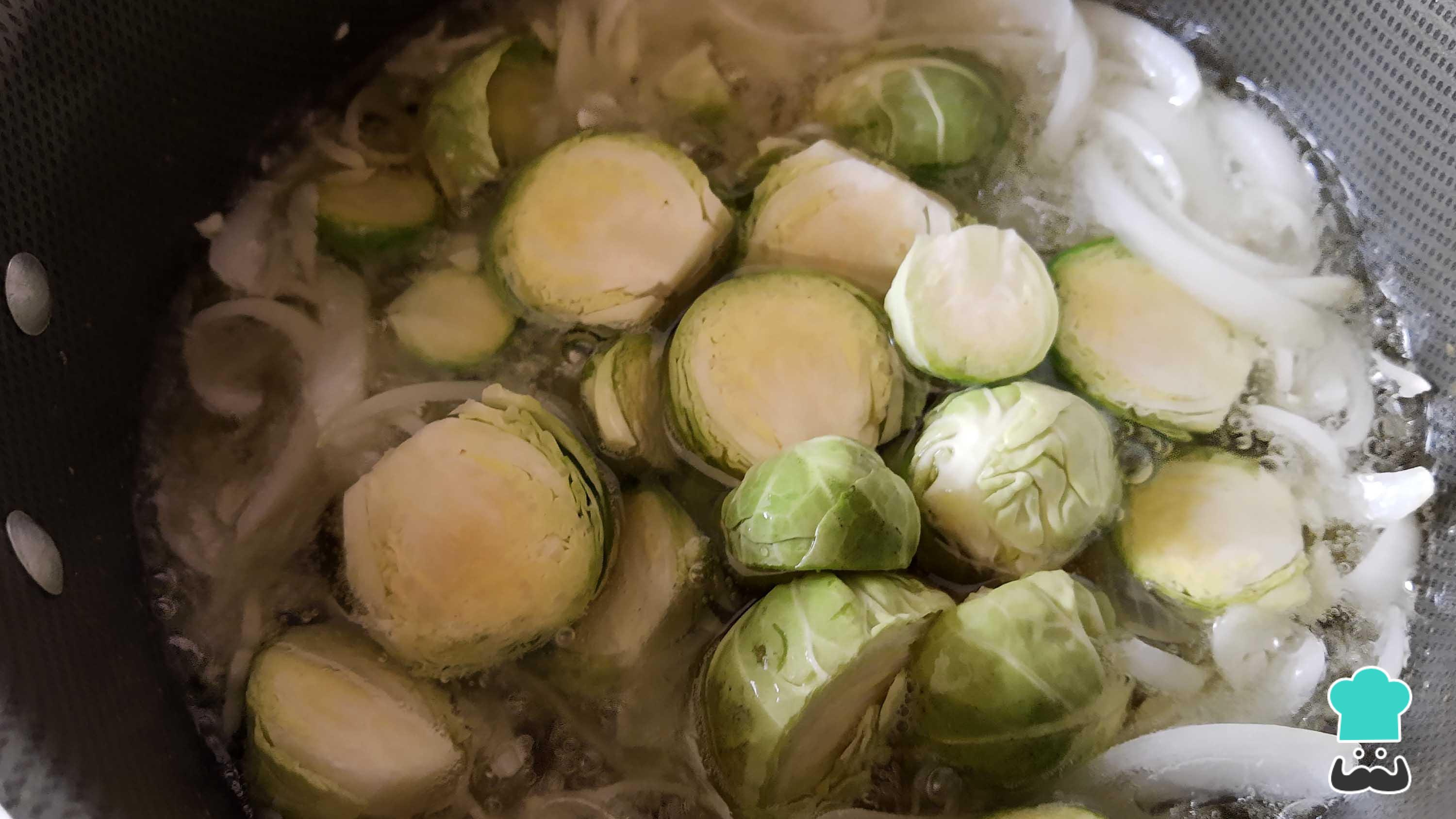 Cuando la cebolla empiece a cambiar su color, agrega a la misma olla los repollitos de Bruselas y vuelve a mezclar. Deja cocinar durante 5 minutos más.