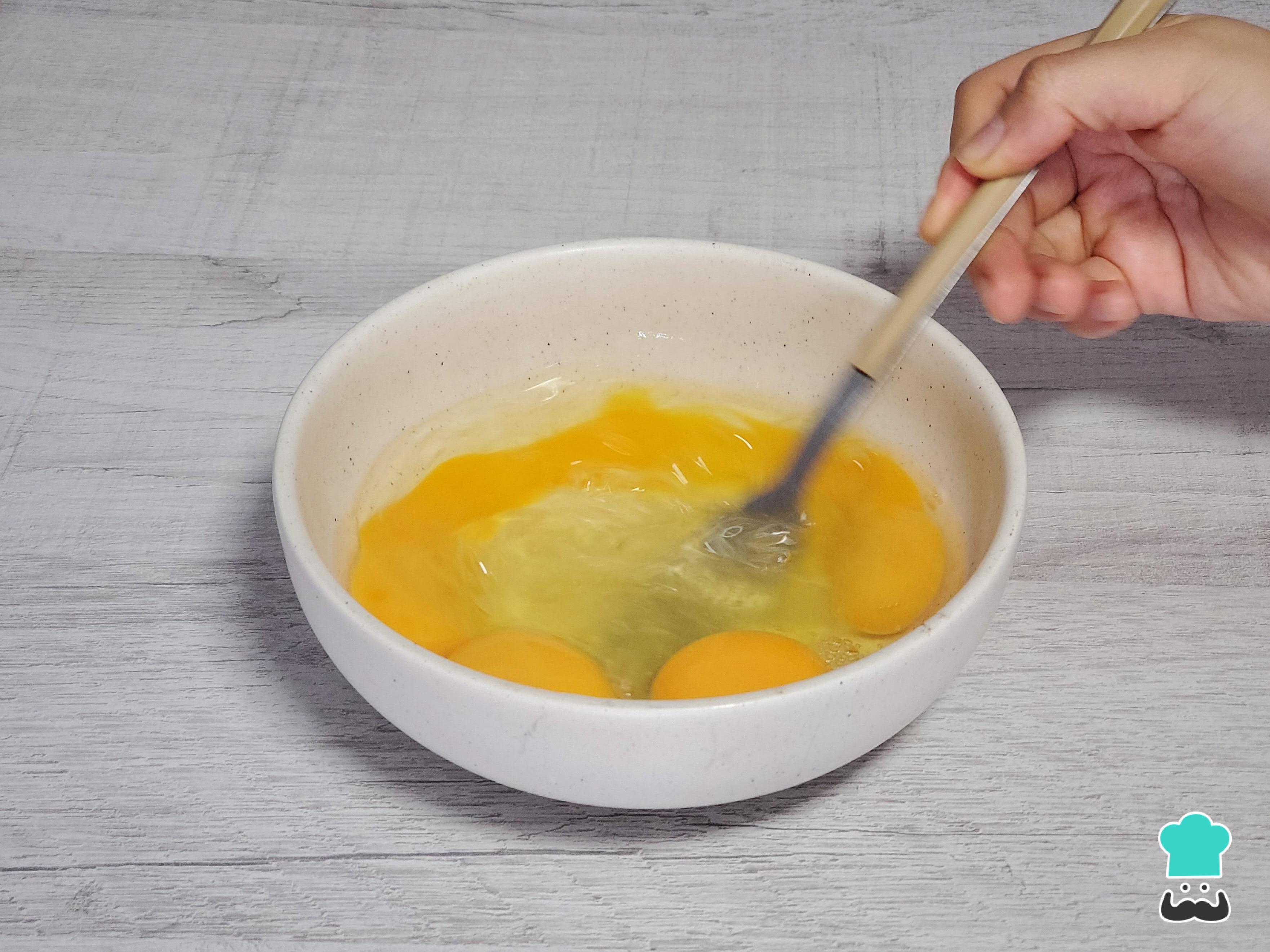 Aparte, en un bowl pequeño rompe los huevos, sazónalos con sal y pimienta, y bátelos o remuévelos con un tenedor o un batidor de globo pequeño.