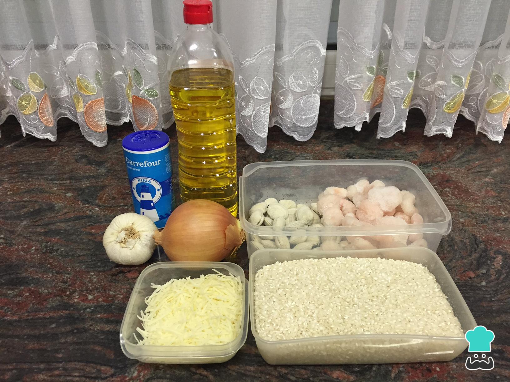 Empezamos preparando todos los productos que necesitamos para elaborar este risotto con marisco sobre la encimera.