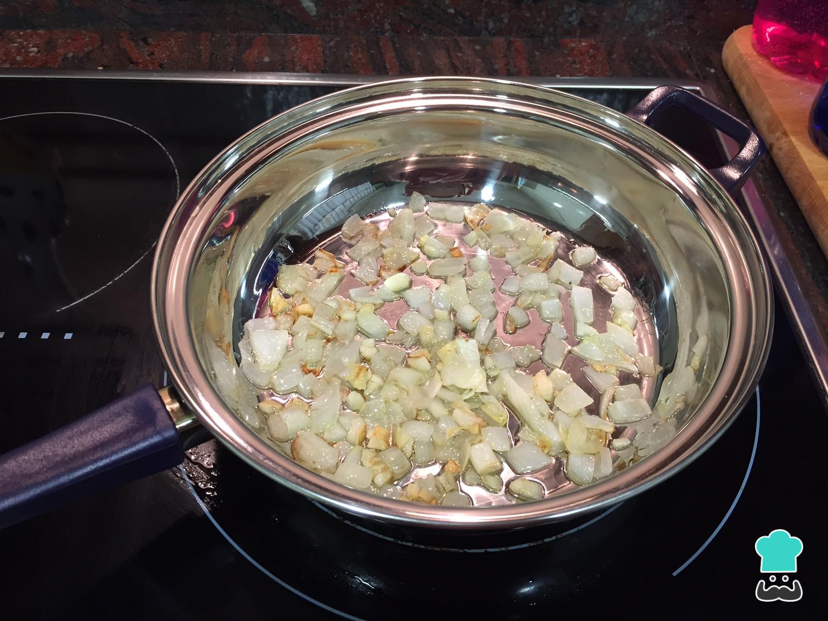 Cortamos media cebolla y la picamos, hacemos lo mismo con los dientes de ajo. Con estos ingredientes preparamos un sofrito.