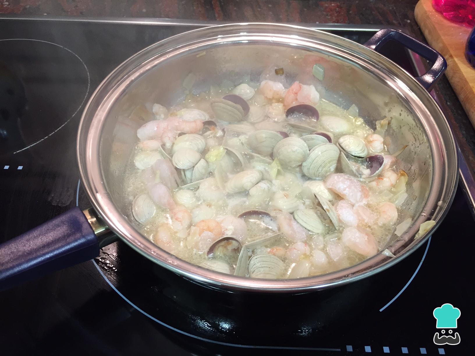 Añadimos las almejas y las gambas al sofrito hasta que las almejas estén completamente abiertas.