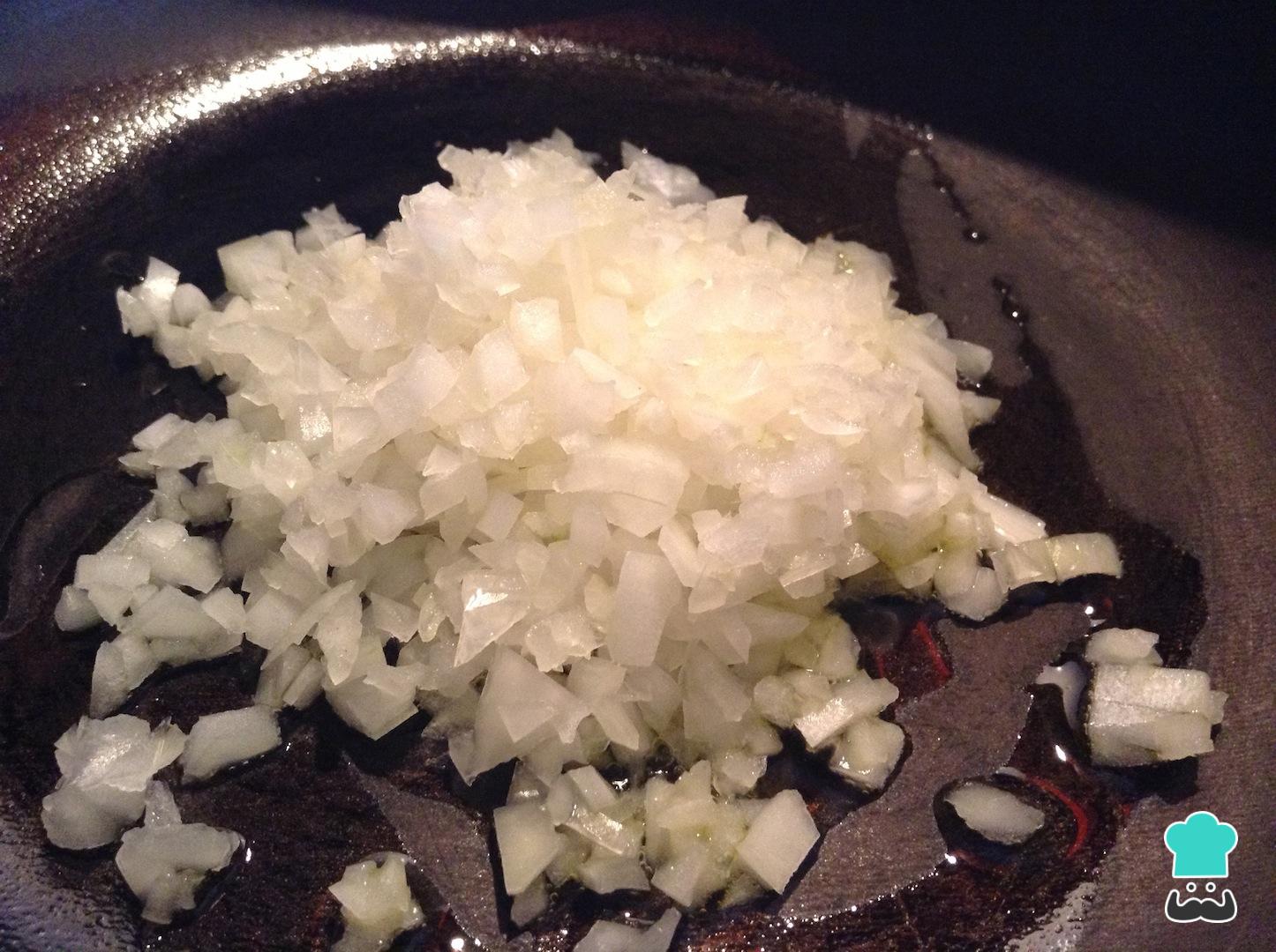 Para hacer el sofrito de cebolla, lleva una olla honda a fuego medio y una vez caliente, agrega un poquito de aceite de oliva y adiciona la cebolla blanca en cuadros finos.