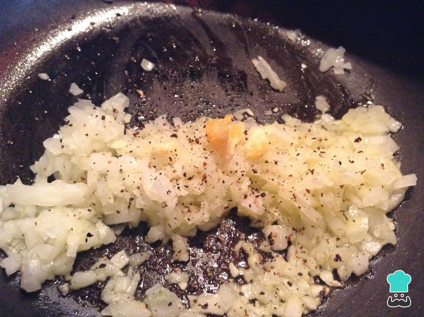 Deja sofreír durante algunos minutos y adiciona sal, pimienta negra y pasta de ajo. Sofríe durante cinco minutos más.