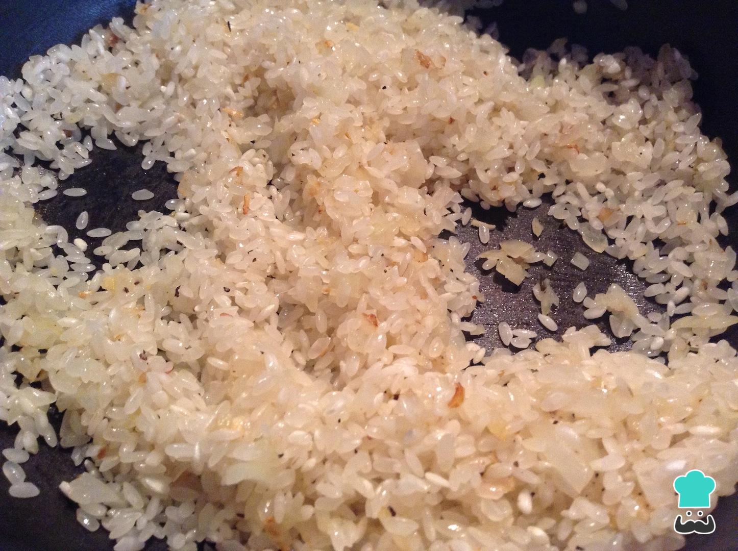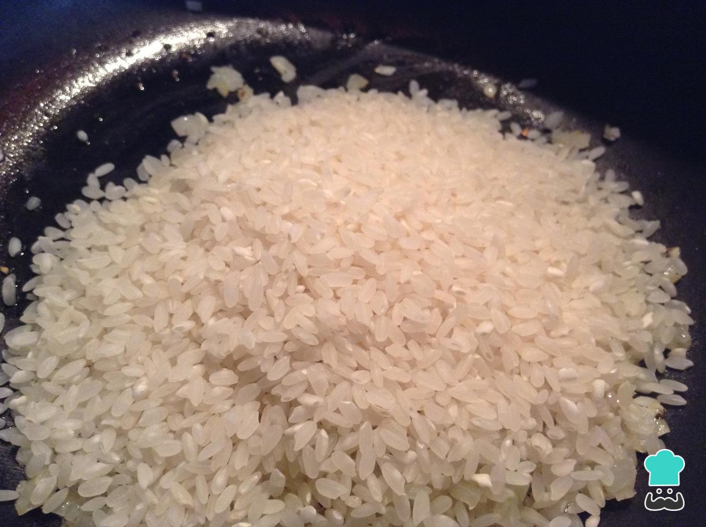 Mezcla el arroz muy bien con la cebolla blanca y deja sofreír durante algunos minutos.