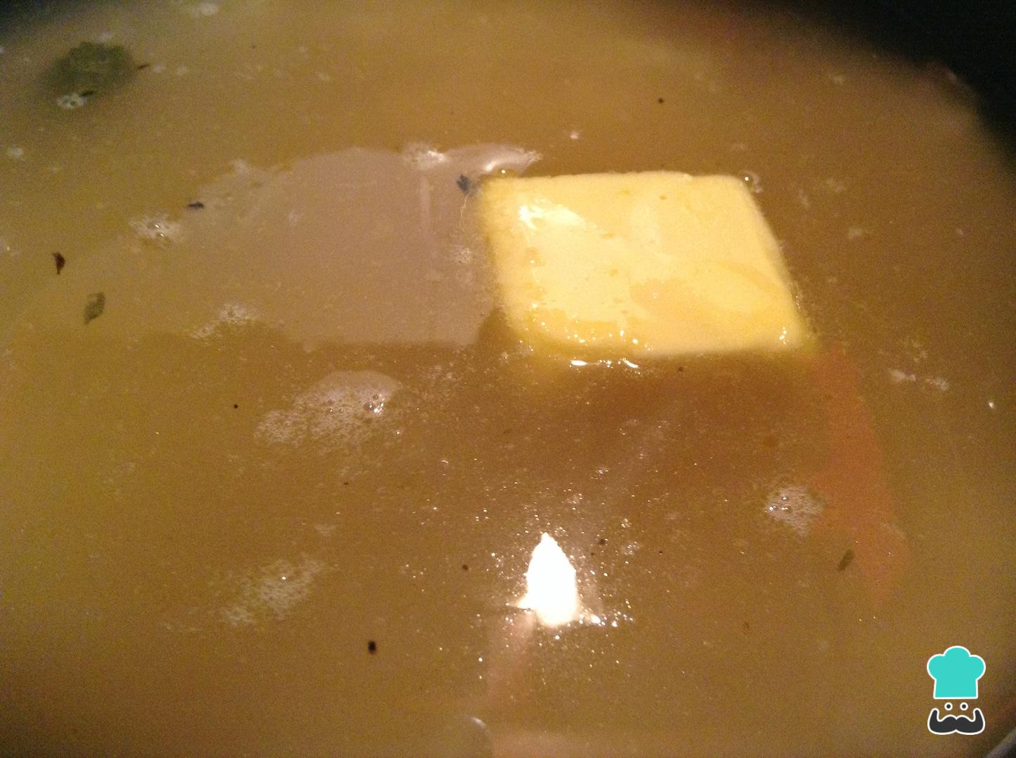 Añade el caldo y la mantequilla sin dejar de remover para que el arroz no se pegue en el fondo de la olla. Cocina el arroz durante 18 a 20 minutos a fuego medio.