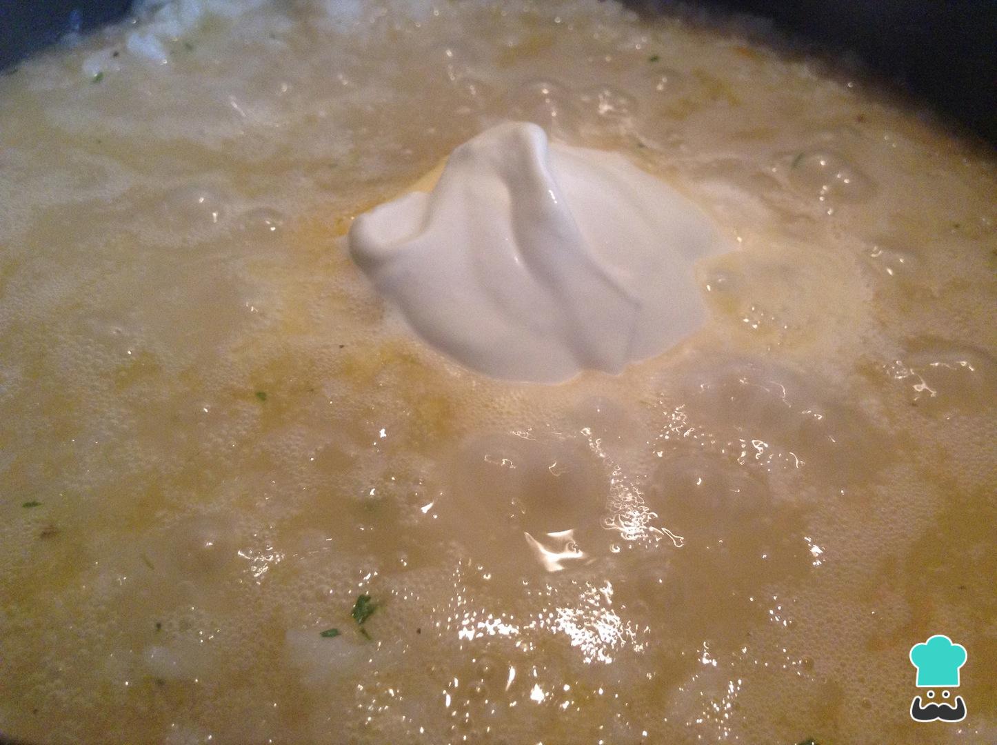 Adiciona el cava, la crema de leche y el queso parmesano a la olla con el risotto. Mezcla muy bien los ingredientes de nuestra receta.
