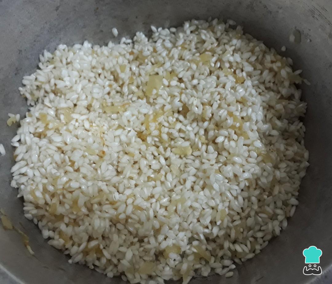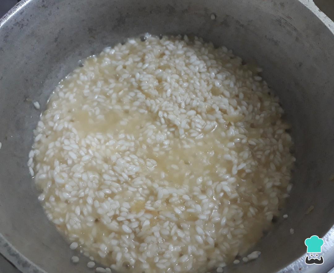 Agrega el arroz arbóreo y saltea durante 3 minutos hasta que los granos se empiecen a volver transparentes.