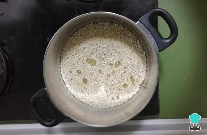 En una cacerola, agrega la quinoa y el caldo de verduras suficiente como para cubrirla por completo. Cocina esta semilla a fuego alto hasta que empiece a hervir. En este punto, baja la temperatura y cuece la quinoa a fuego lento con la olla tapada. Añade una cucharada de caldo si se queda sin líquido.