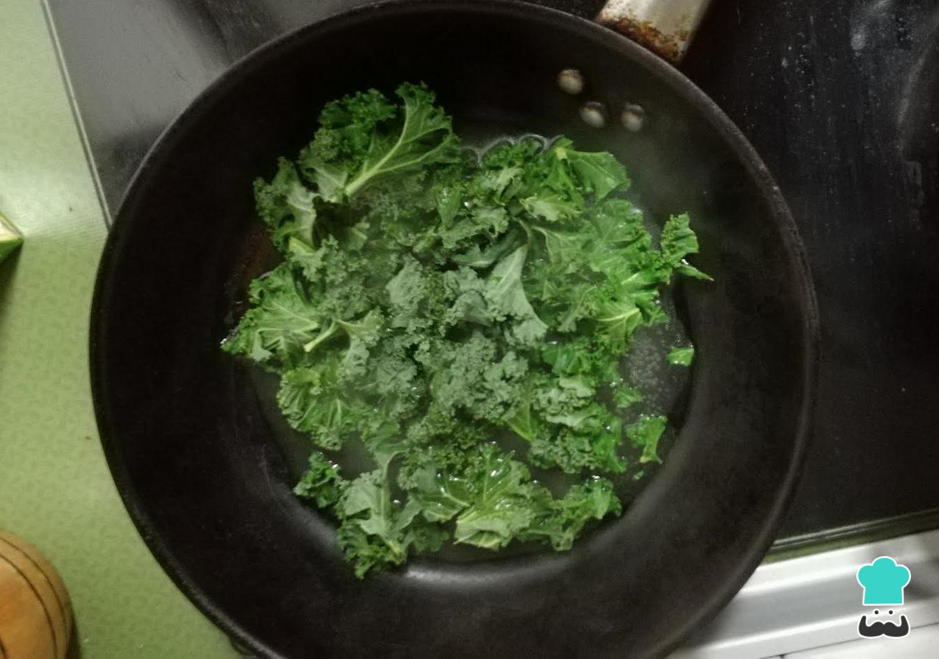 Una vez que el ajo esté ligeramente dorado, incorpora la col rizada a la sartén, agrega una cucharada de caldo de verduras y saltea durante 6 minutos aproximadamente.