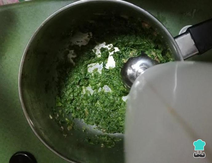 Después de 6 minutos más, agrega la espinaca fresca picada y la taza de vino blanco. Deja la preparación a fuego lento durante dos minutos para que se integren los ingredientes y se forme una salsa ligera.