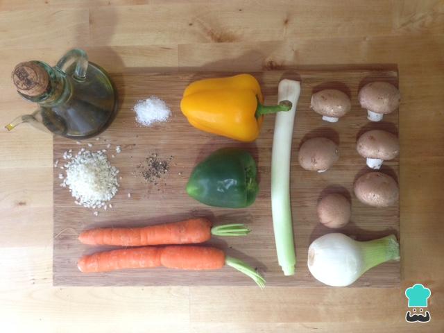 Reunimos todos los ingredientes para elaborar el risotto vegano con de verduras y setas.