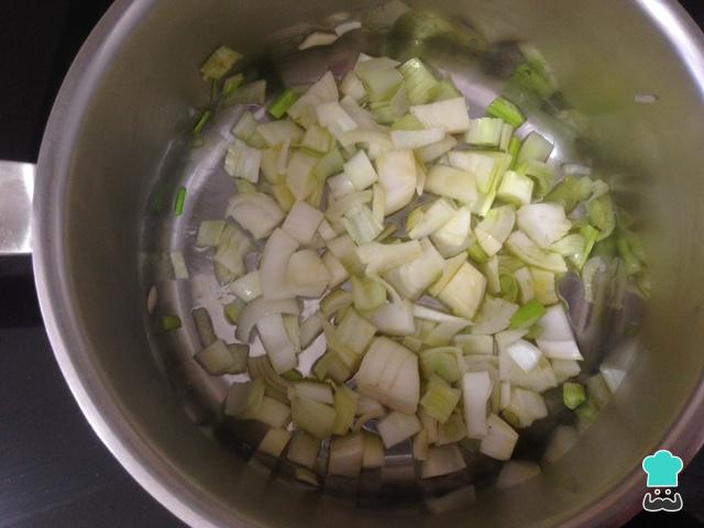 En una olla sofreímos el puerro y la cebolleta cortados de forma fina.