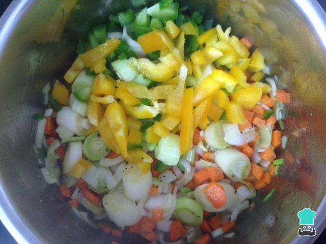 A continuación añadimos la zanahoria en cuadraditos y los pimientos cortados tal y como se ve en la imagen del paso. Añadimos un poco de sal y de pimienta negra molida. Dejamos cocinar durante 5 minutos a fuego medio.