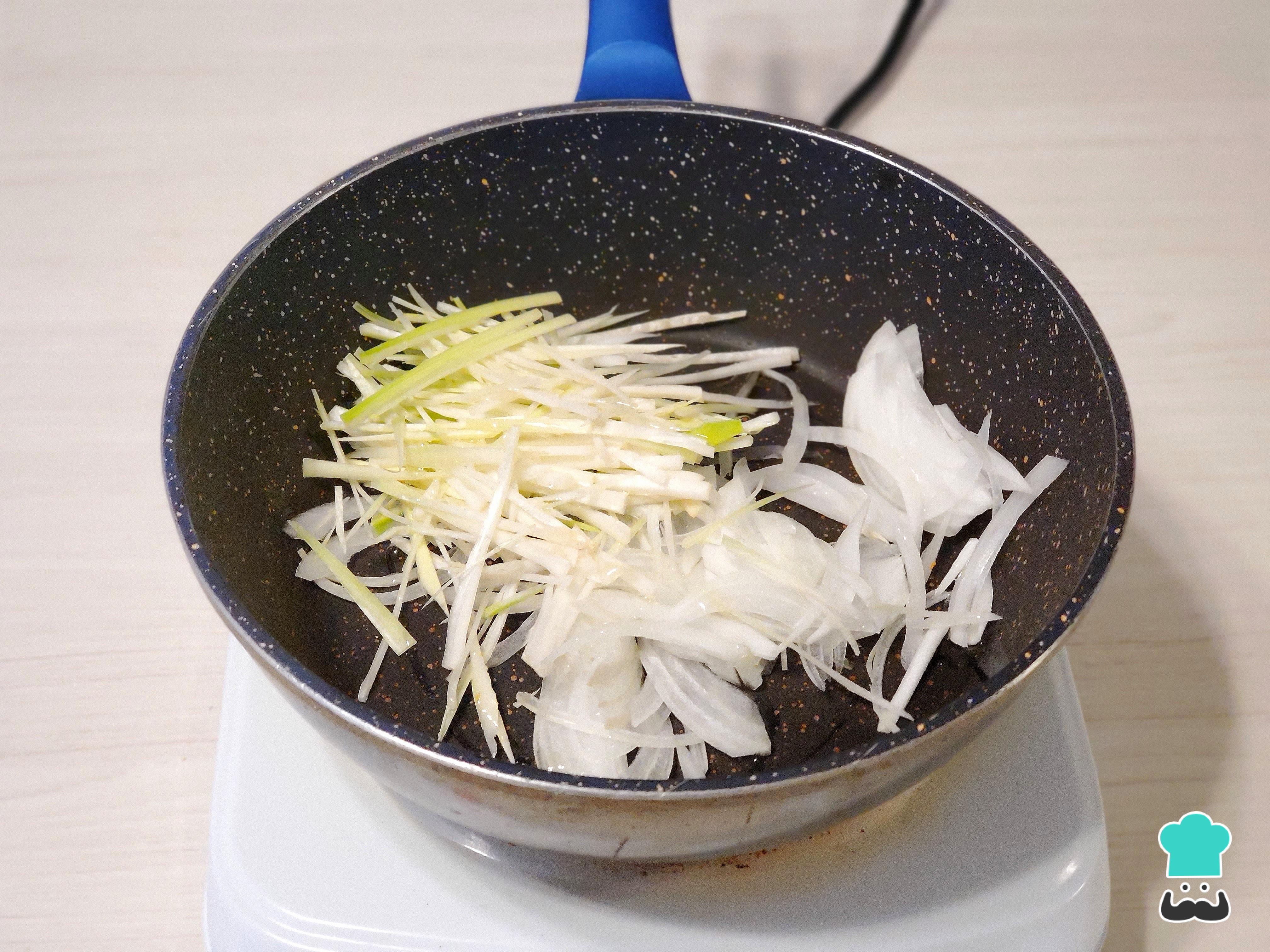 Calienta un wok o una sartén grande, vierte un chorro de aceite de oliva y coloca la cebolla en pluma y el poro en juliana. Remueve hasta que la cebolla se vea traslúcida y el poro esté suave.