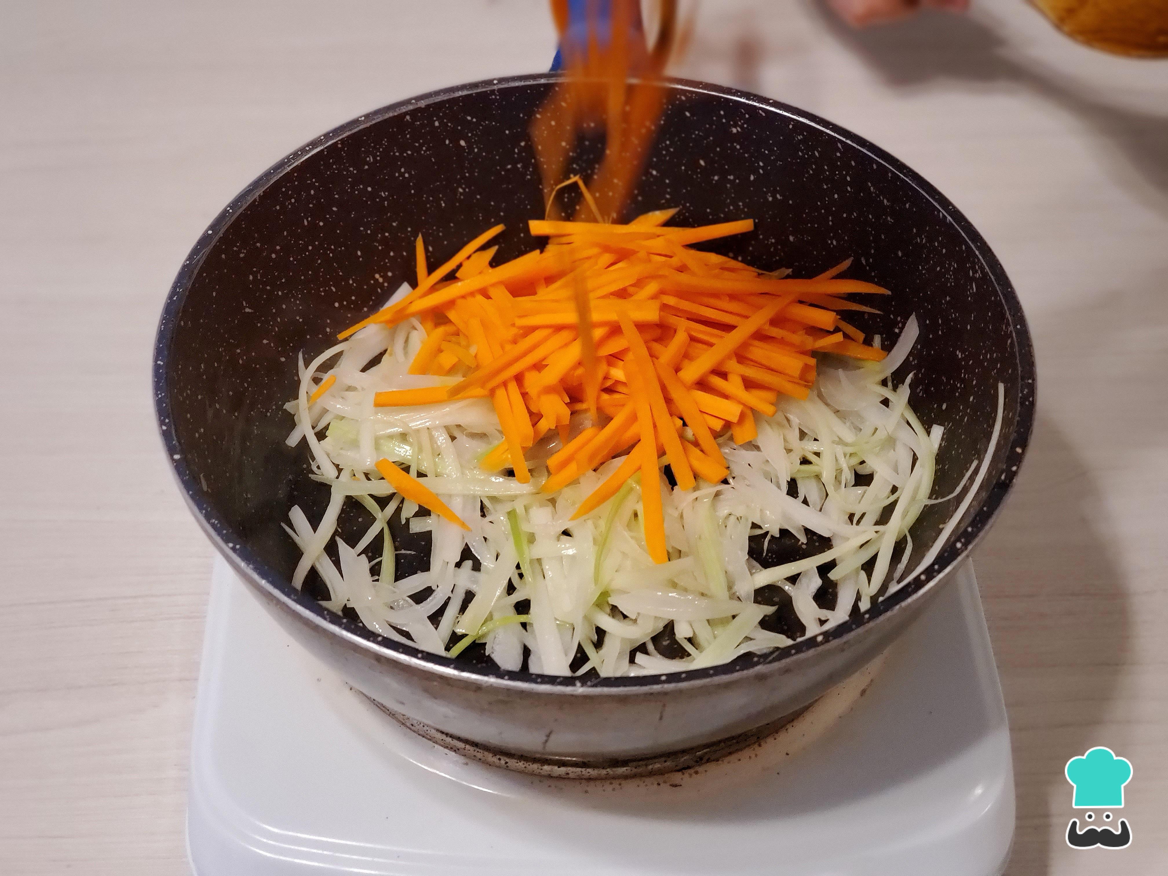 Agrega la zanahoria en juliana y deja cocinar por un par de minutos removiendo de vez en cuando para evitar que los vegetales se doren.