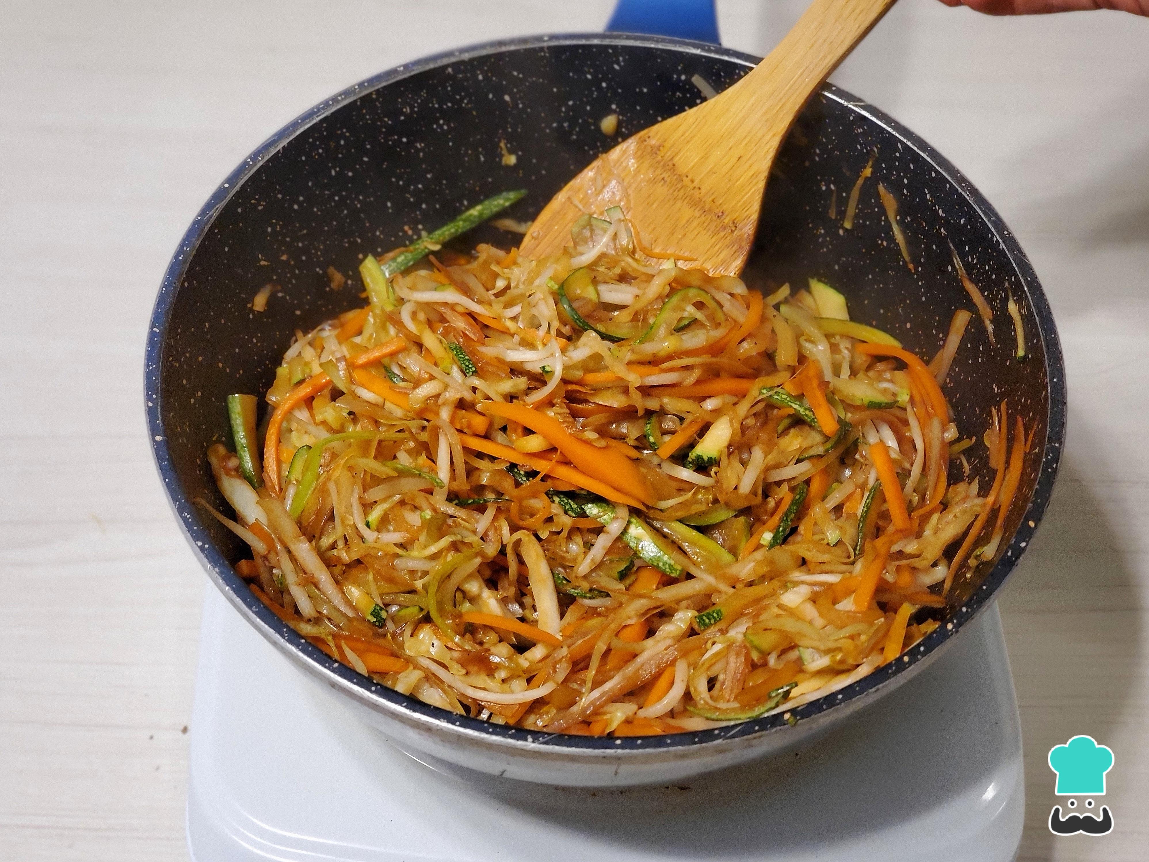 Cuando la zanahoria esté al dente, incorpora el repollo y el zucchini en juliana. Mezcla bien.