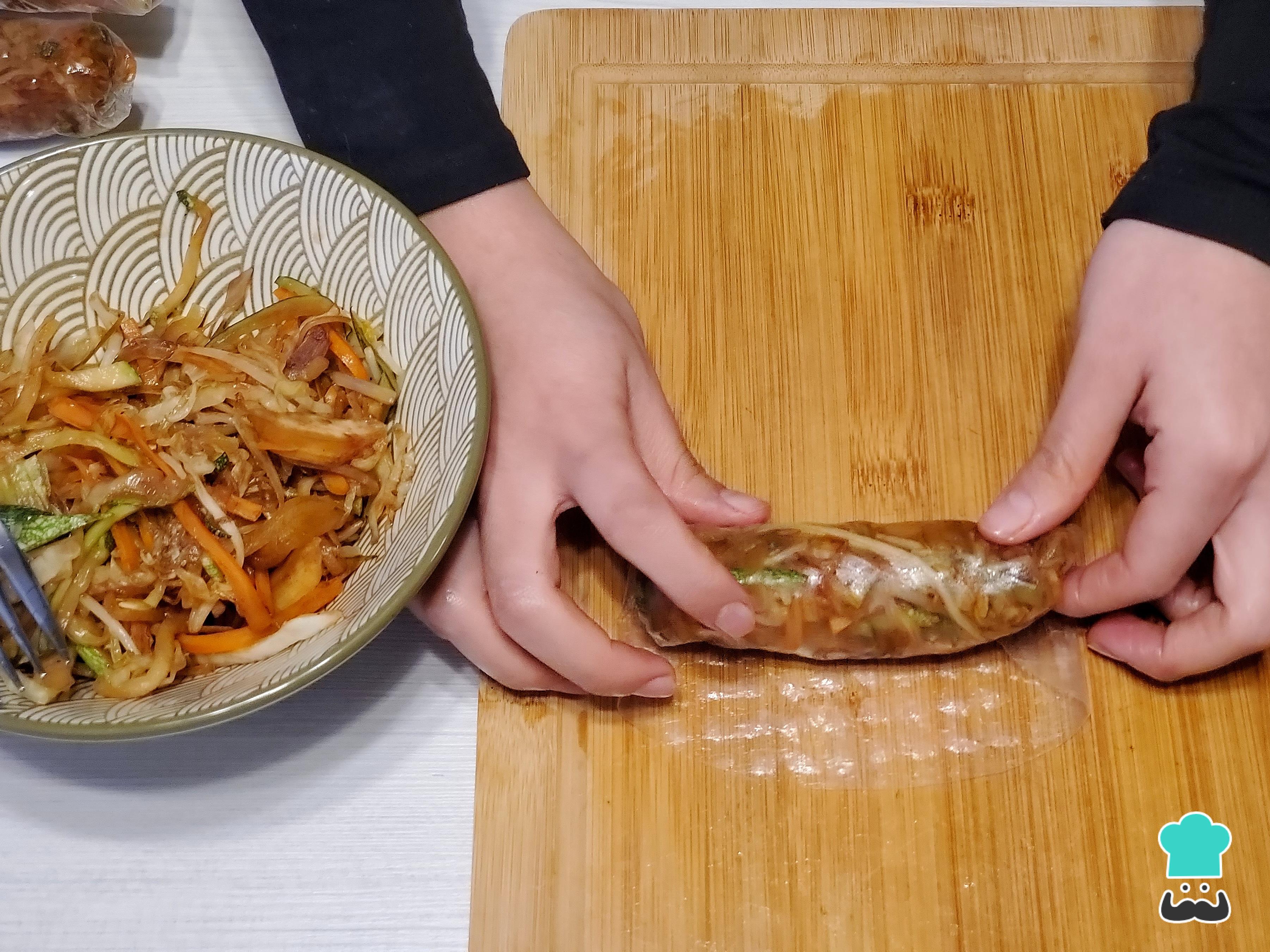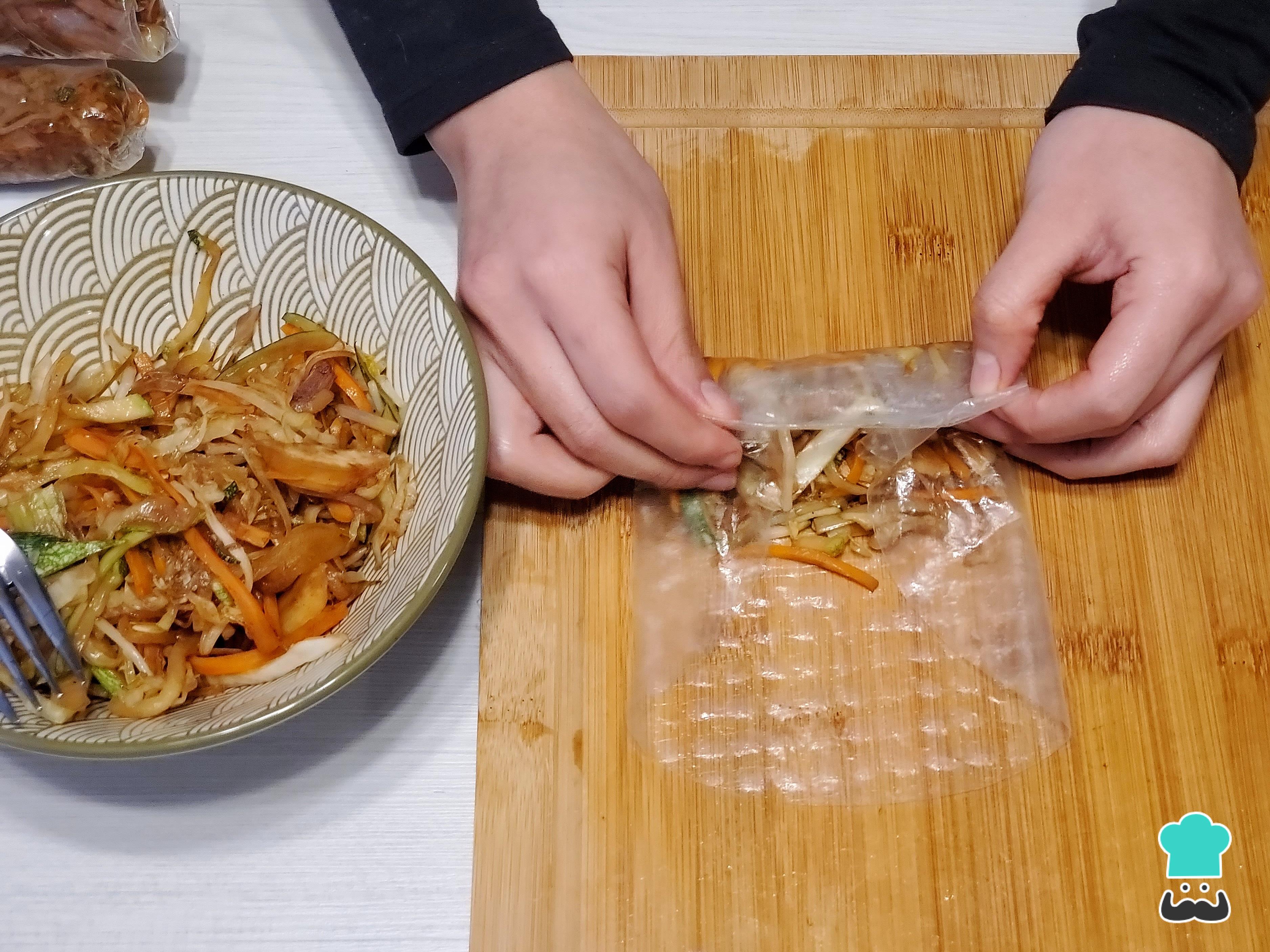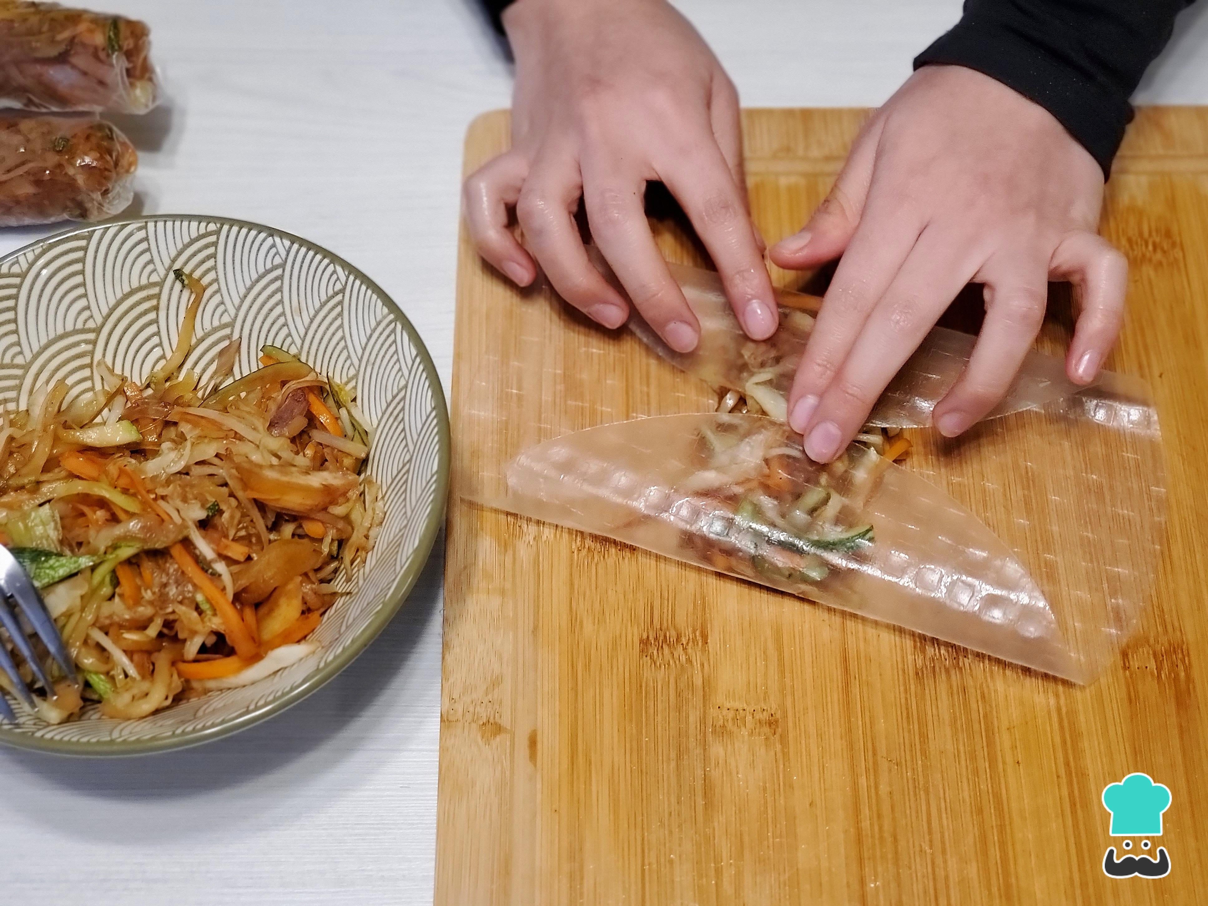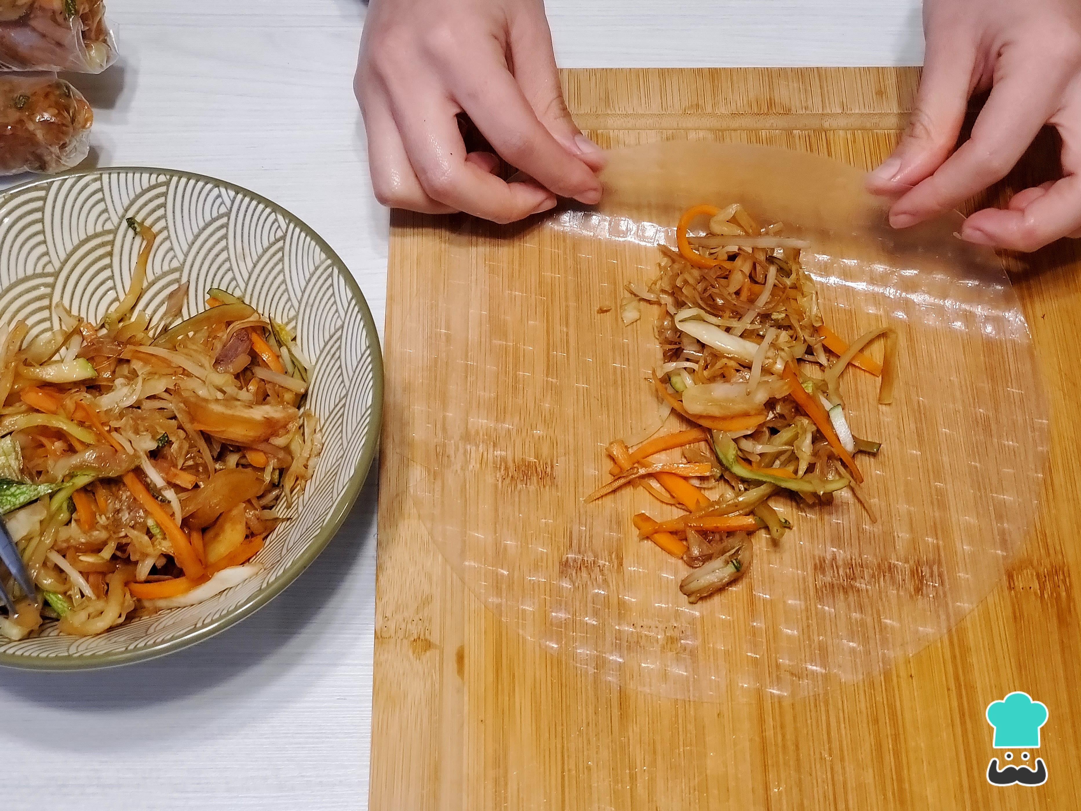 - Notarás que la masa se va poniendo más flexible, así que rápidamente coloca el relleno para los rollitos de primavera y dobla como te explicamos anteriormente.