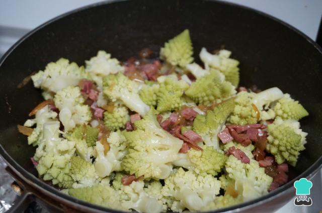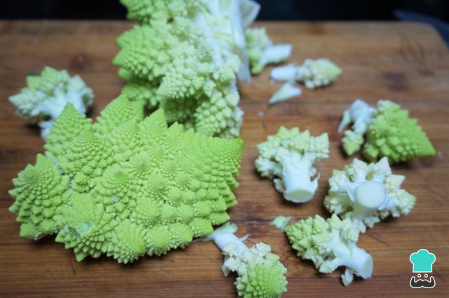 Para empezar con la receta de romanescu con jamón, primero debes limpiar el romanescu, separarlo en brotes y lavar con agua bajo el grifo.