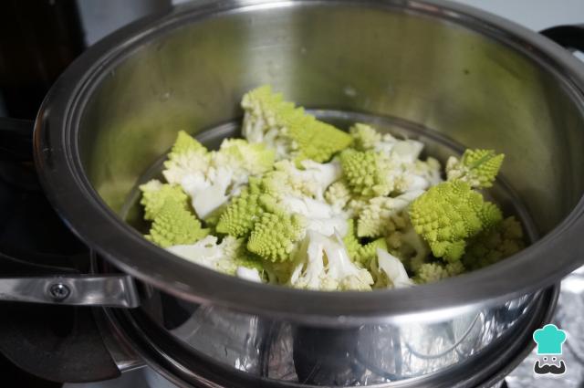 Coloca una olla con abundante agua y un puñado de sal. Seguido, cuando empiece a hervir el agua añade los brotes de romanescu, déjalos unos 15 minutos o hasta que lo veas cocido. Cuando observes que está, reserva y guarda un poco del agua de la cocción. Señalamos que también puedes hacer el romanescu al vapor, solo debes añadir un poco de agua en una cazuela y en la parte superior colocar otra con agujeros, tapar y dejar que se cocine. Este sistema de cocción hará que la verdura pierda menos propiedades y no se empape de agua.