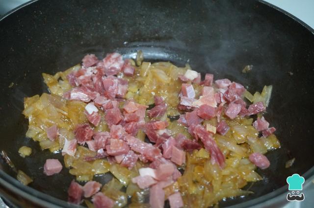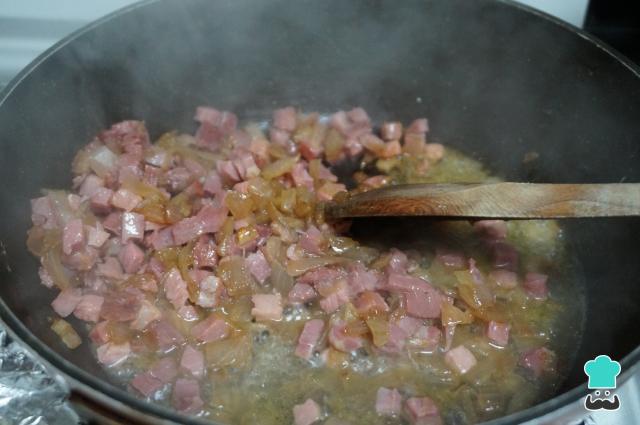 Pica la cebolla en trozos o en tiras y el jamón en taquitos. Seguido, coloca una cazuela amplia al fuego con un chorro de aceite, añade la cebolla y deja que se cocine hasta que empiece a coger color. Luego, añade el jamón en tacos y deja que se cocine unos minutos todo junto.