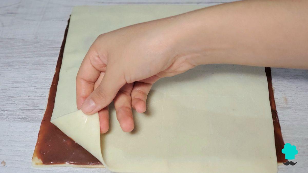 Truco: Puedes aprovechar la masa excedente para formar más rosas. Extiende una fina capa de crema de chocolate sobre la porción de hojaldre, coloca otra pieza del mismo tamaño encima y luego enrolla con cuidado hasta obtener una espiral compacta.