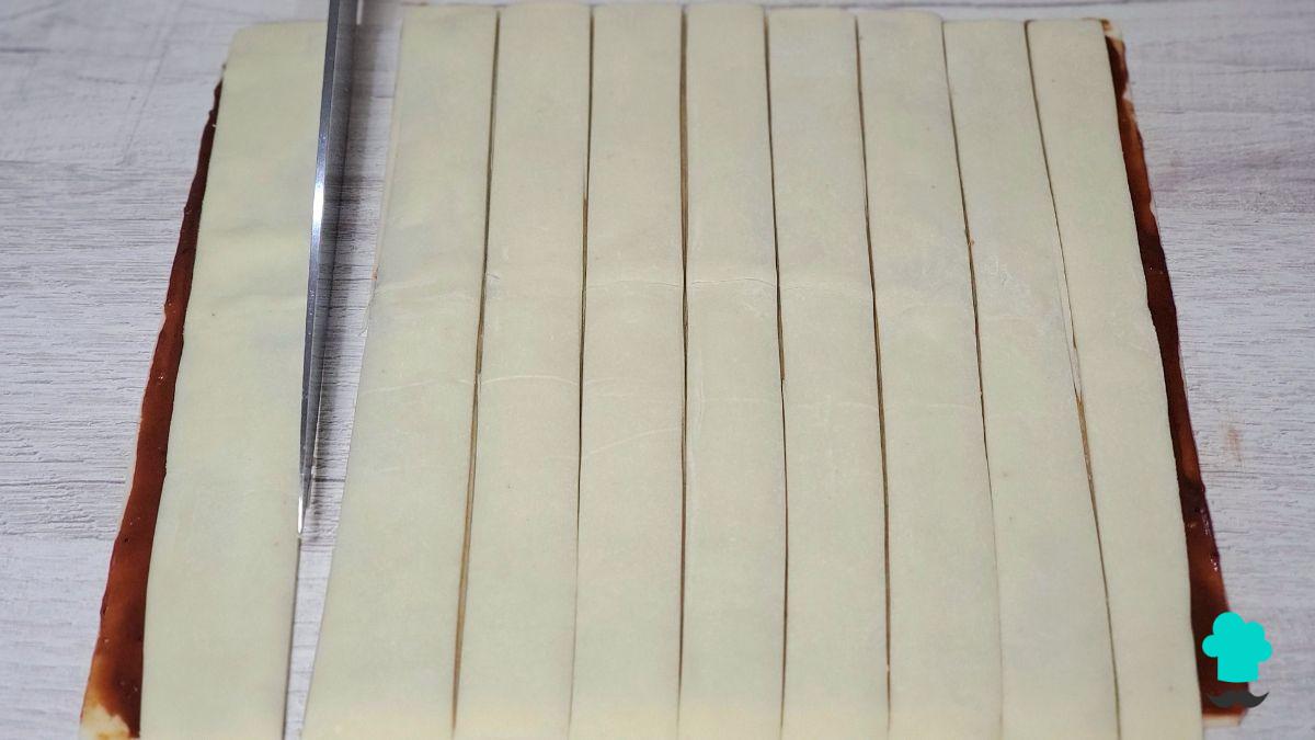 Con un cuchillo afilado, corta la masa en tiras de aproximadamente dos dedos de grosor. Este tamaño es ideal para obtener rosas medianas.