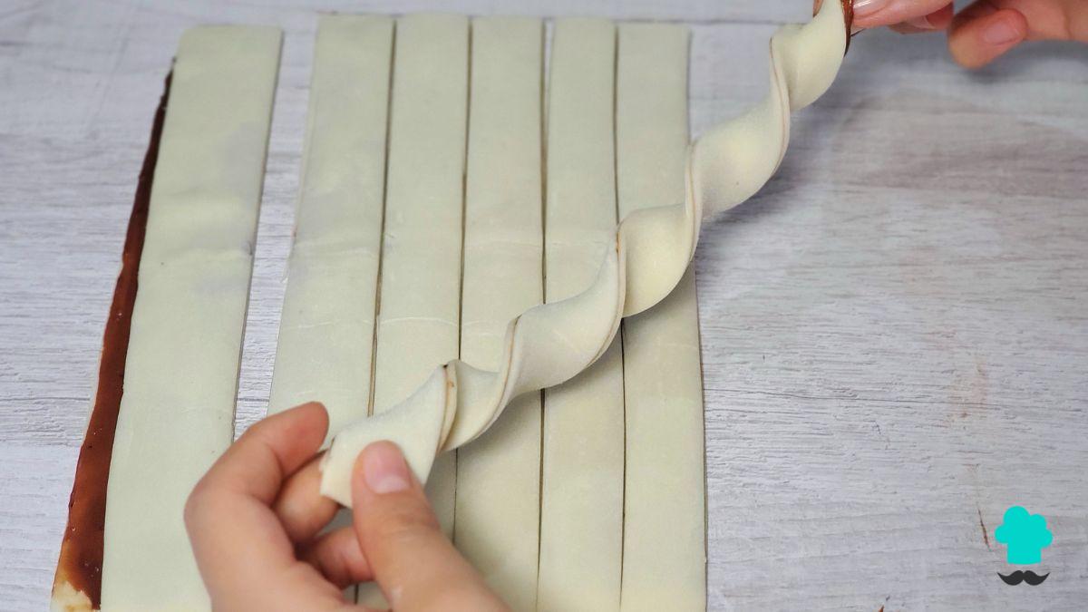 Coloca la tira sobre una placa cubierta con un tapete de silicona o papel manteca y dale forma espiral. Repite el procedimiento con todas las tiras hasta llenar la bandeja.