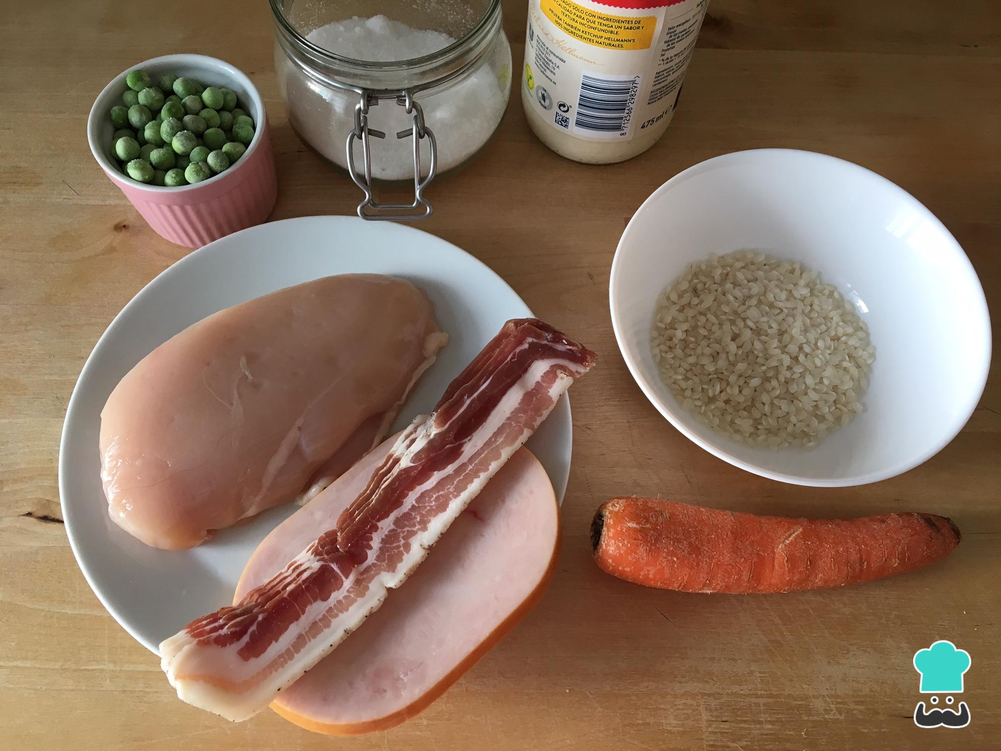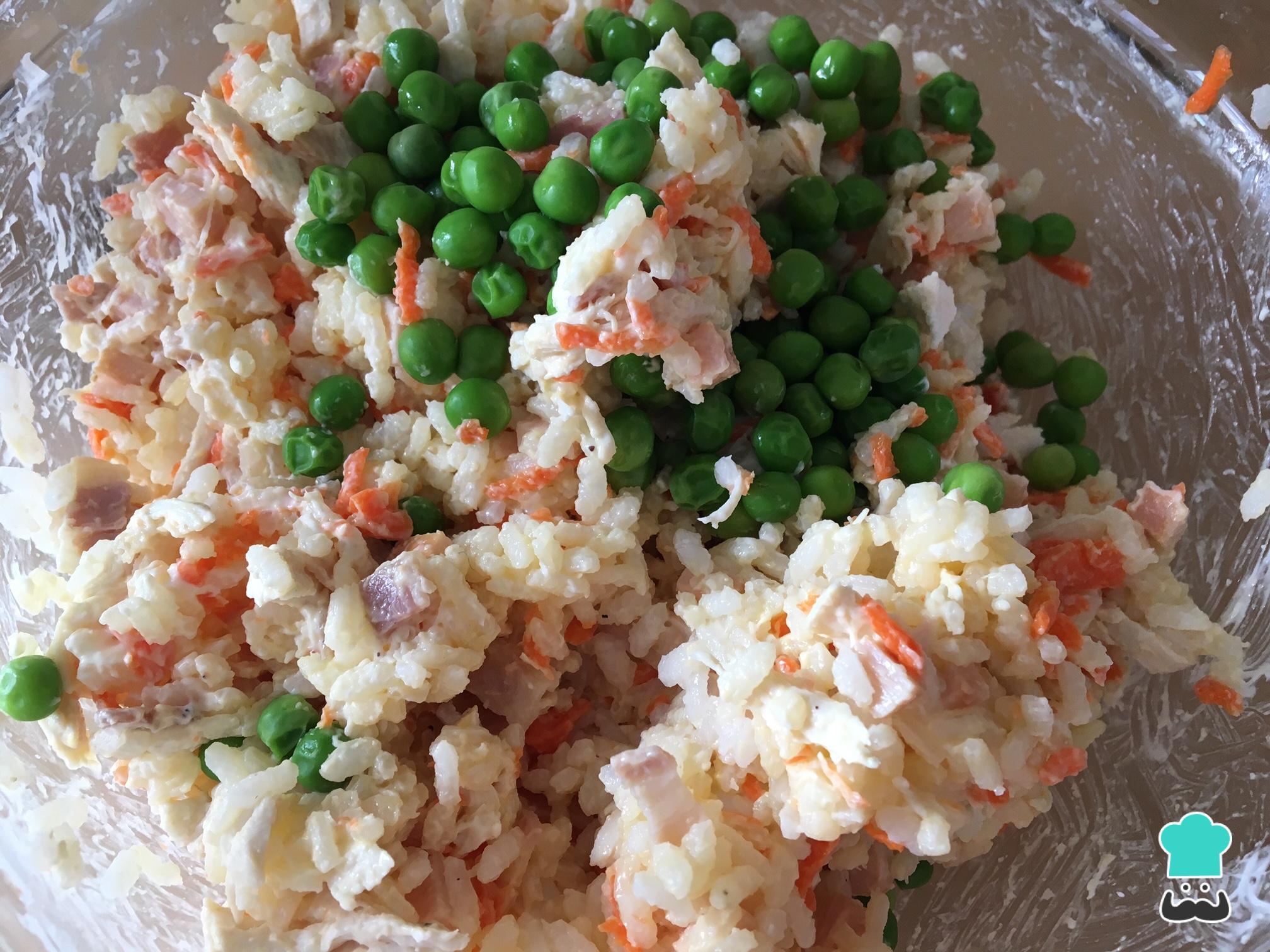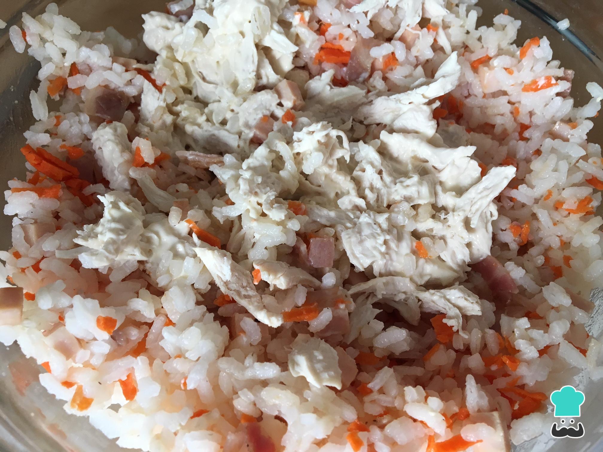 En un bol mezclamos los ingredientes. Así, añadimos el arroz, el pollo cocido y desmigado, la zanahoria, el jamón dulce y el bacon. Salpimentamos al gusto.