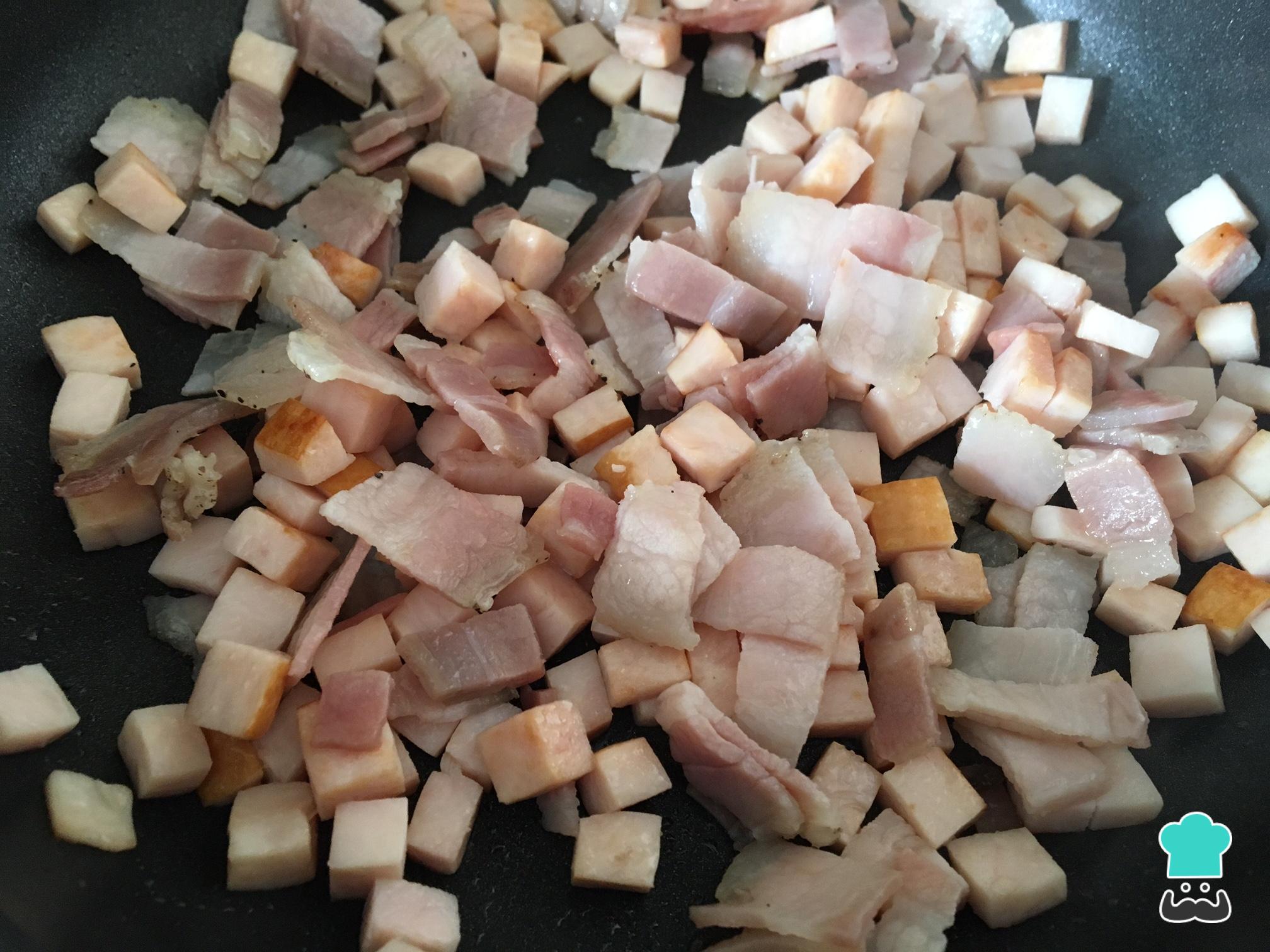 En una sartén salteamos el jamón cocido y el bacon. De estas forma, estos ingredientes quedarán más sabrosos y, por tanto, la rosca de Navidad también.