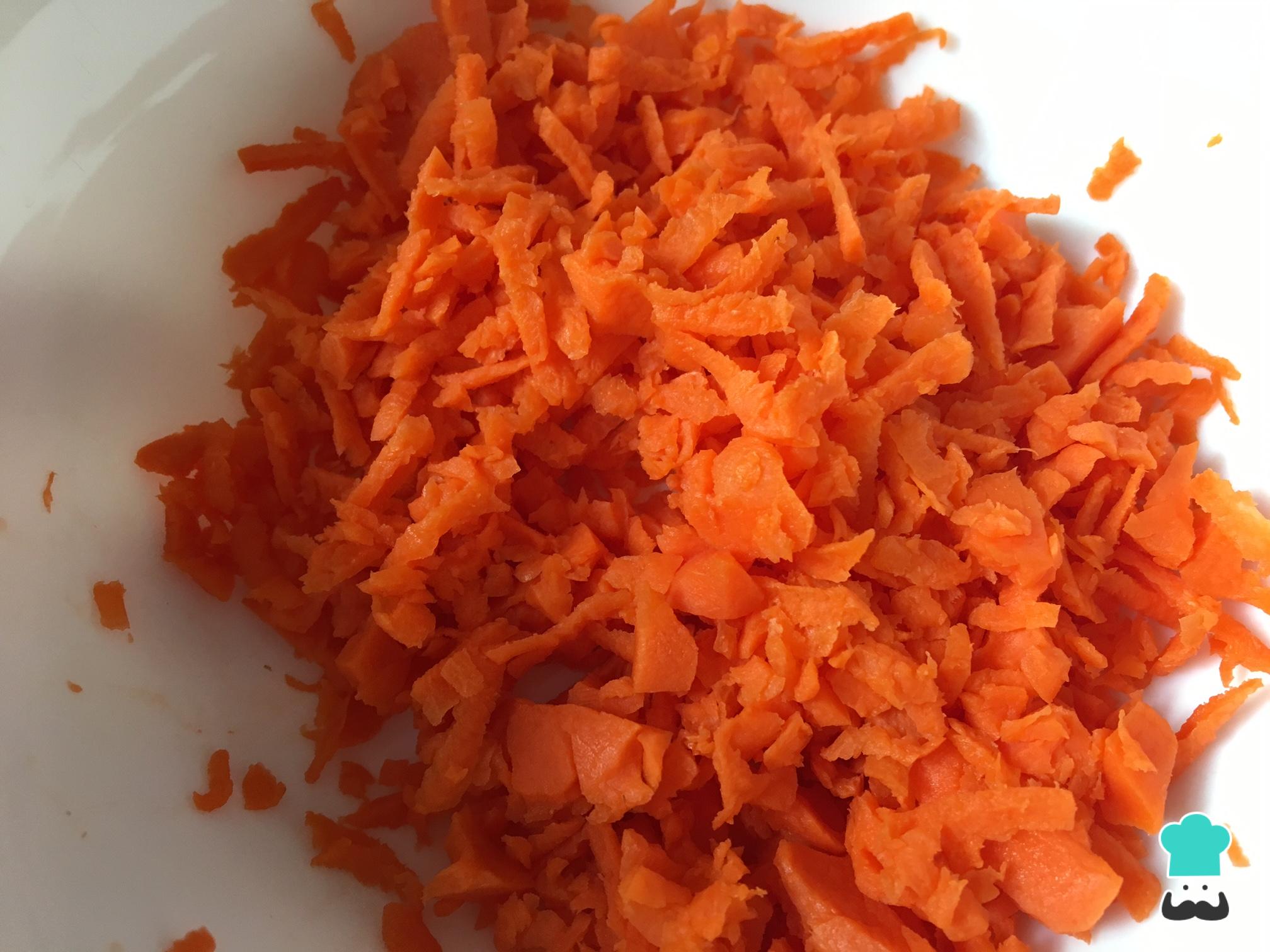 Por otro lado, pelamos y rallamos la zanahoria con ayuda de un rallador. Si no tienes rallador, puedes cortarla en cuadraditos pequeños.