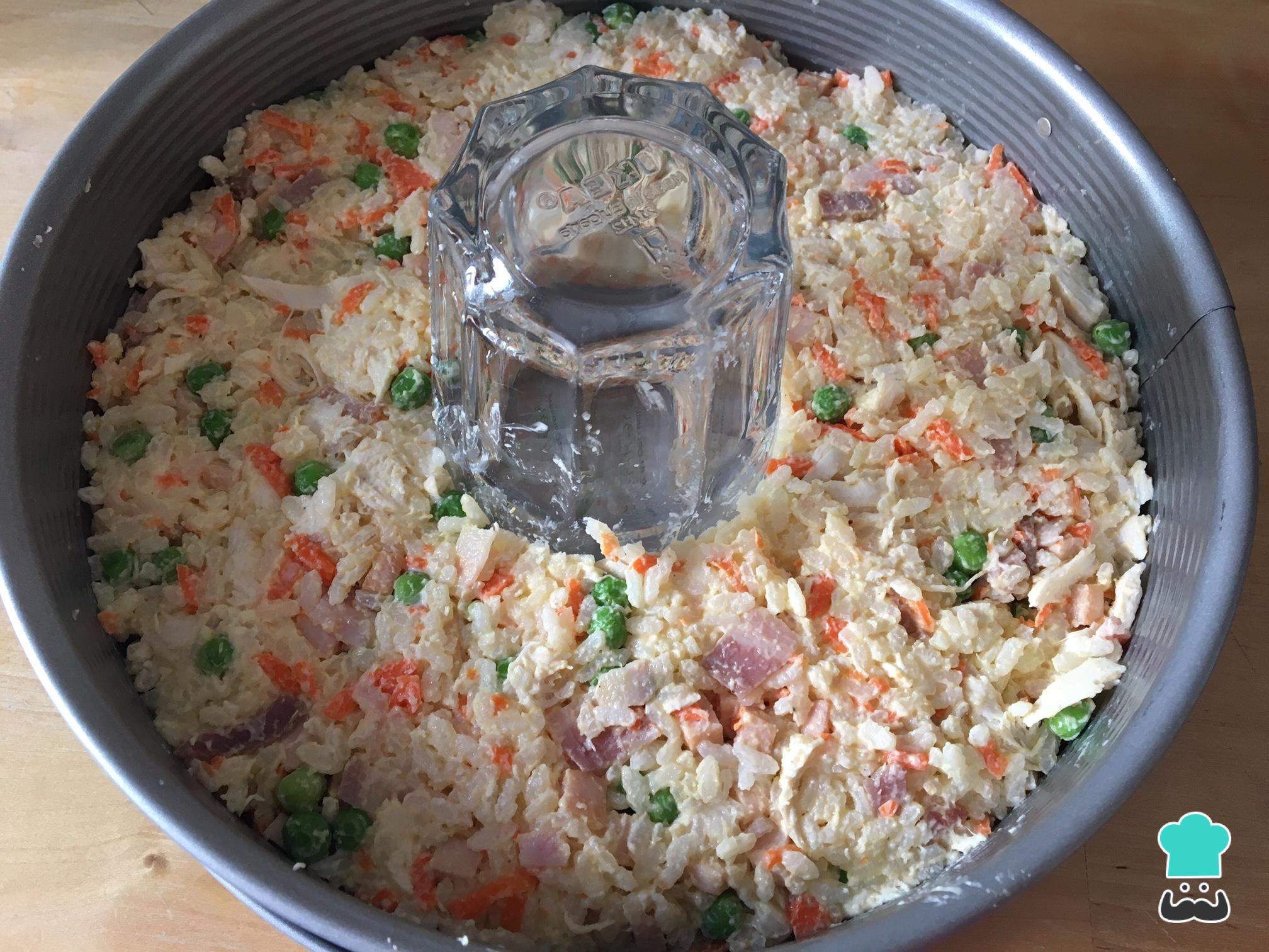 Ponemos el relleno para el pastel de arroz en un recipiente con forma de rosca. Y si no dispones de él, puedes utilizar un recipiente redondo con algún vaso en el centro como hemos hecho nosotros. Metemos en la nevera durante 30 minutos.
