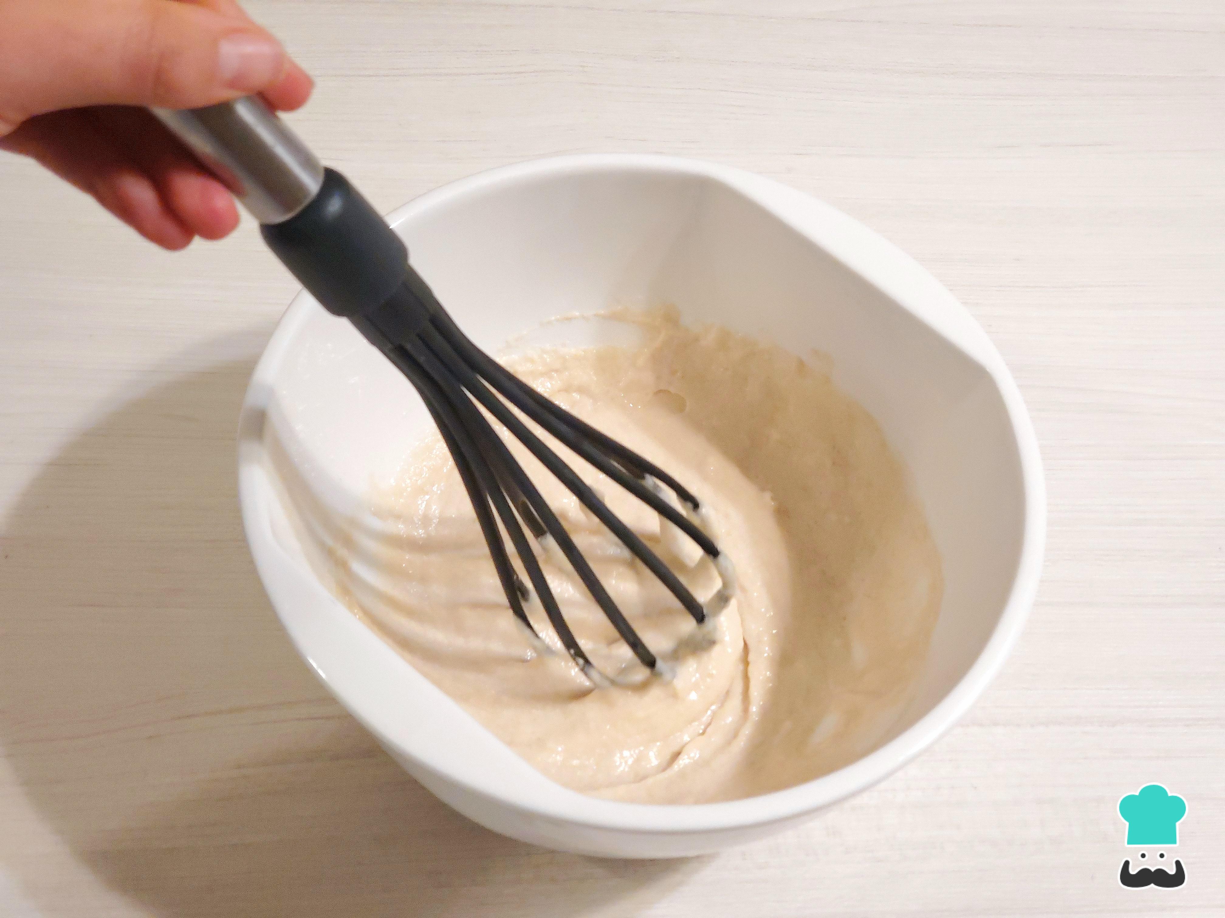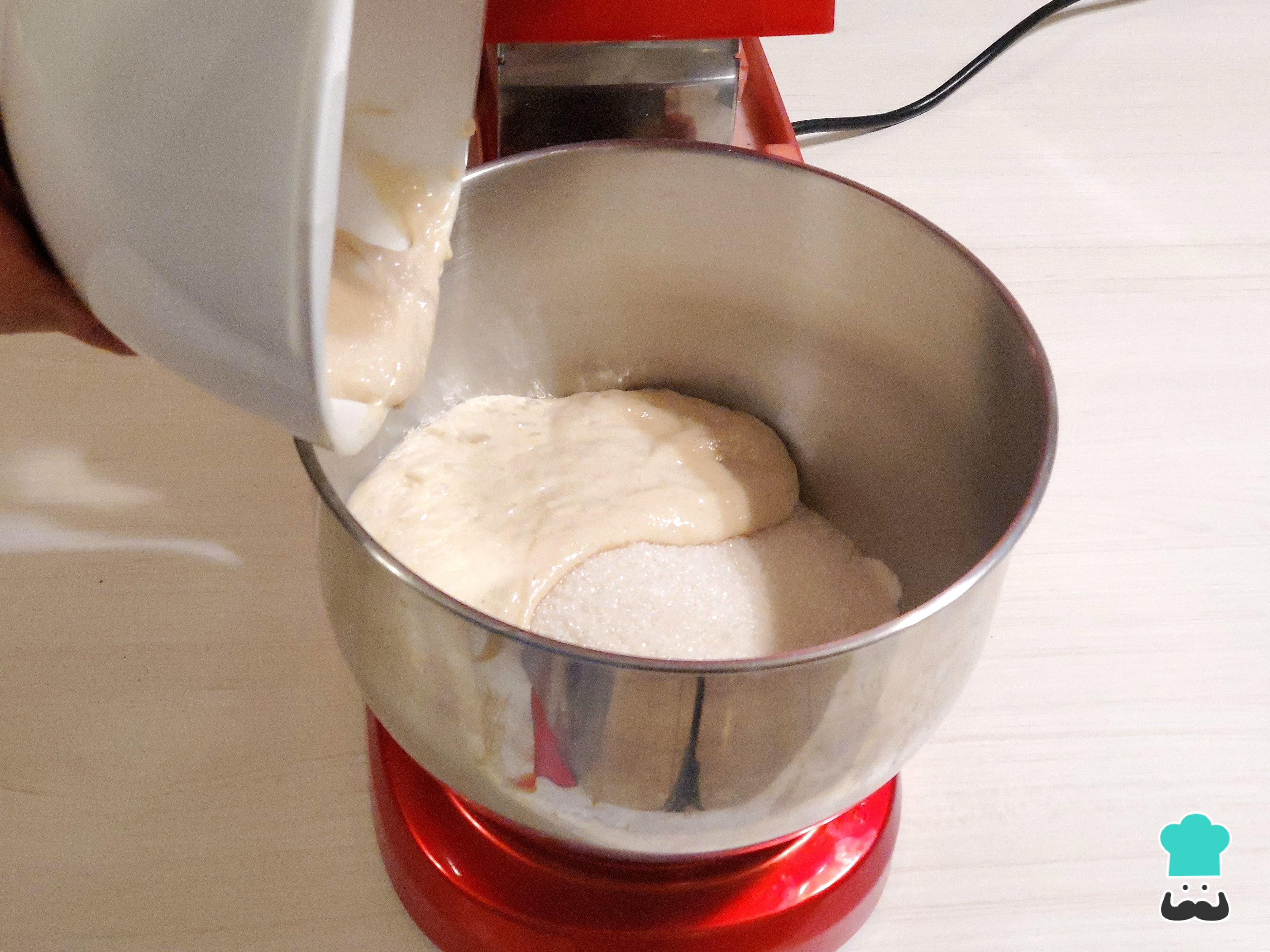 Comienza mezclando con una paleta y, cuando notes que se está formando una masa, cambia al gancho para amasar durante al menos 10 minutos a velocidad alta. Notarás que la masa, después de estar granulada, se vuelve lisa y se enrolla en el gancho dejando las paredes del bowl libres.