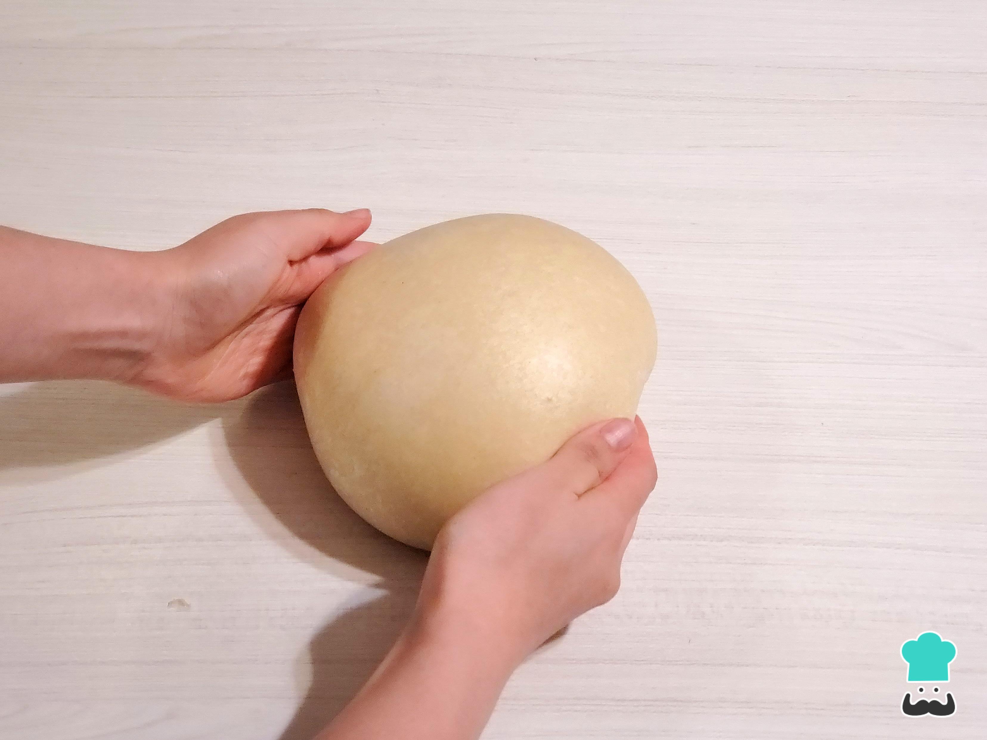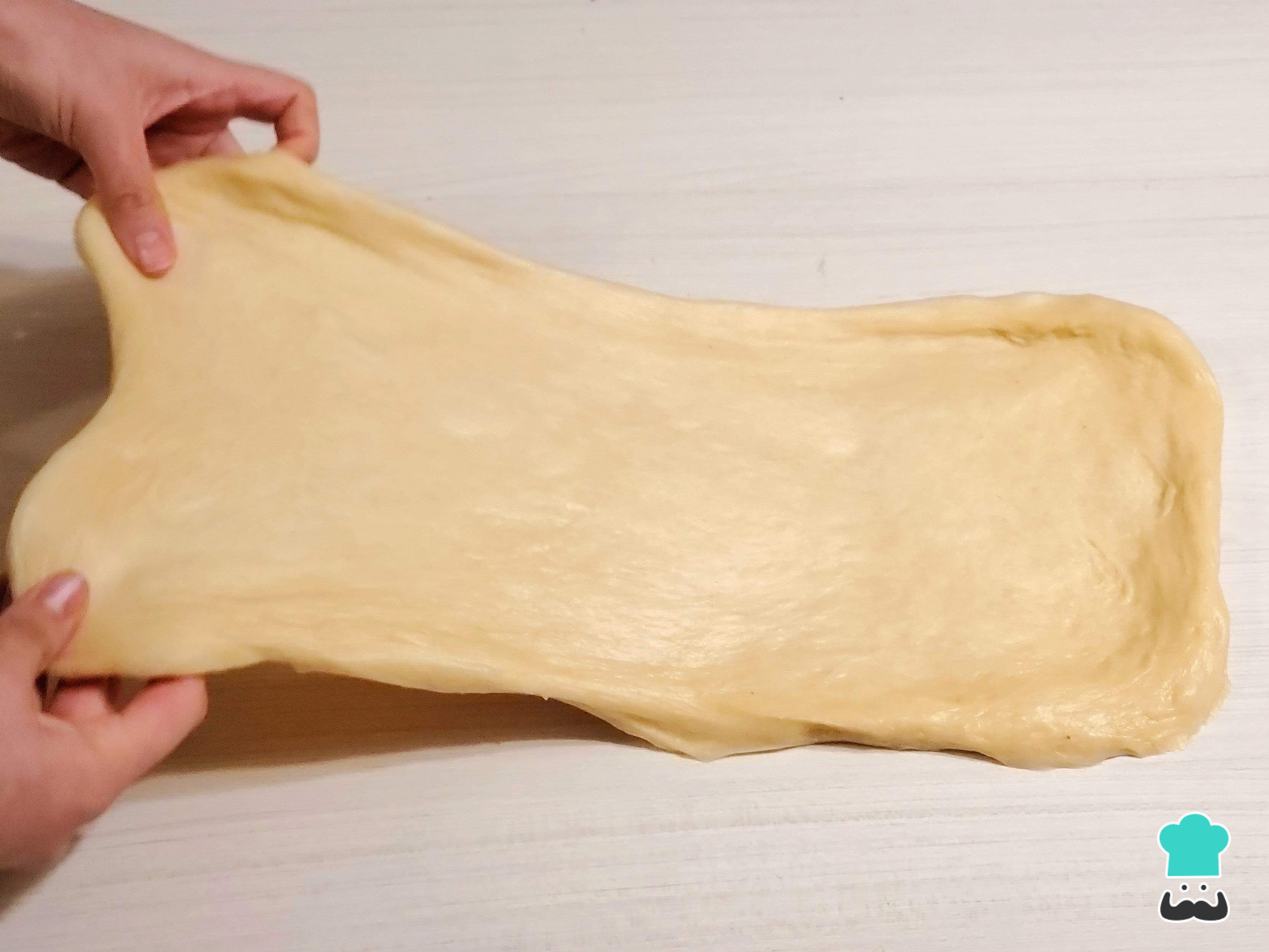 Cuando la masa haya duplicado su volumen, retírala del bowl y estírala hasta formar un rectángulo delgado de aproximadamente medio centímetro de grosor. Para estirarla, jala con las manos sobre todo en las esquinas y en el centro; luego, si deseas, alisa suavemente la superficie con un rodillo de madera solo para emparejar.
