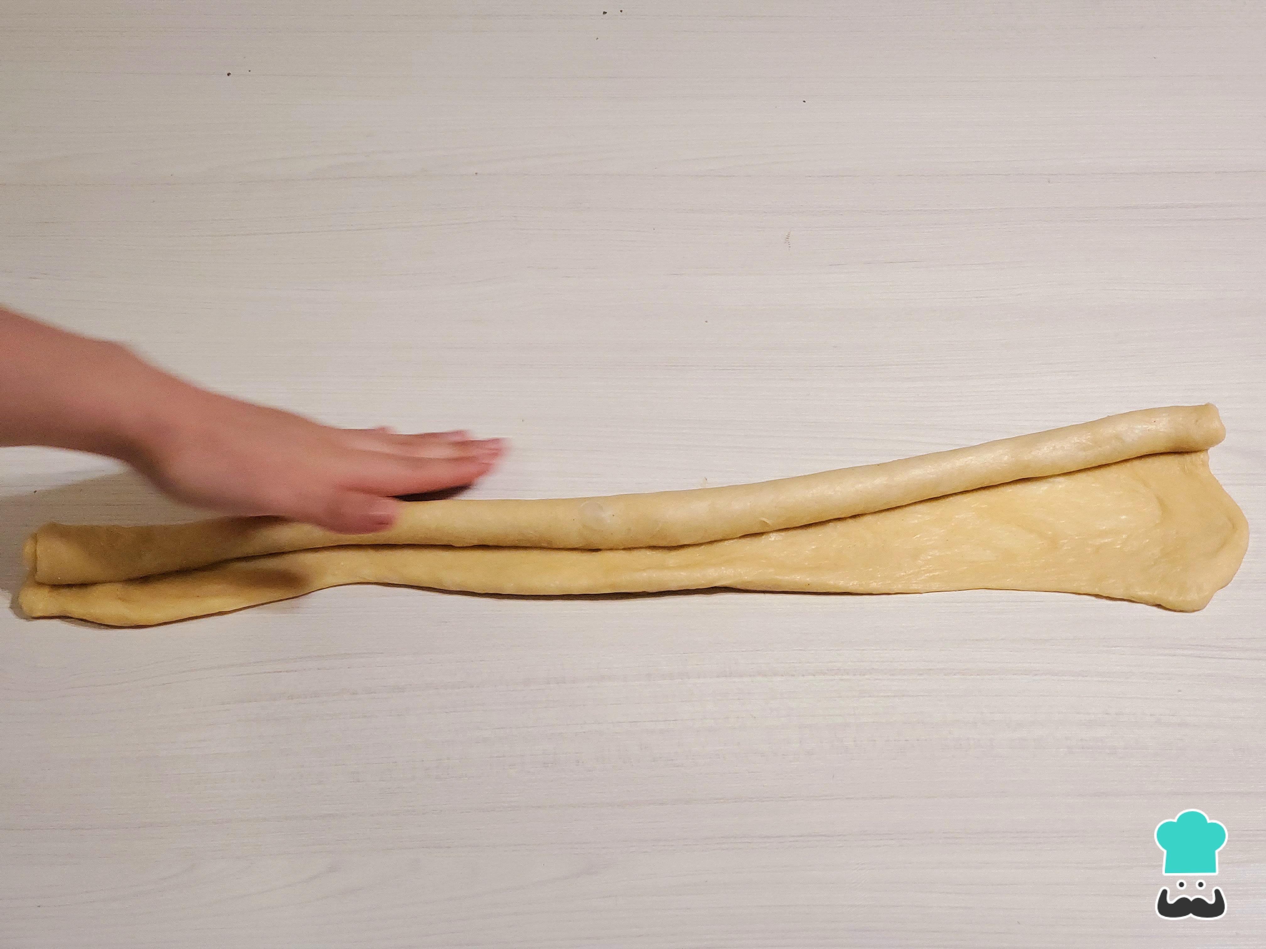 Enrolla por la parte más larga y sella la unión. Si alguna parte quedó más gruesa, estírala con las manos para emparejar.