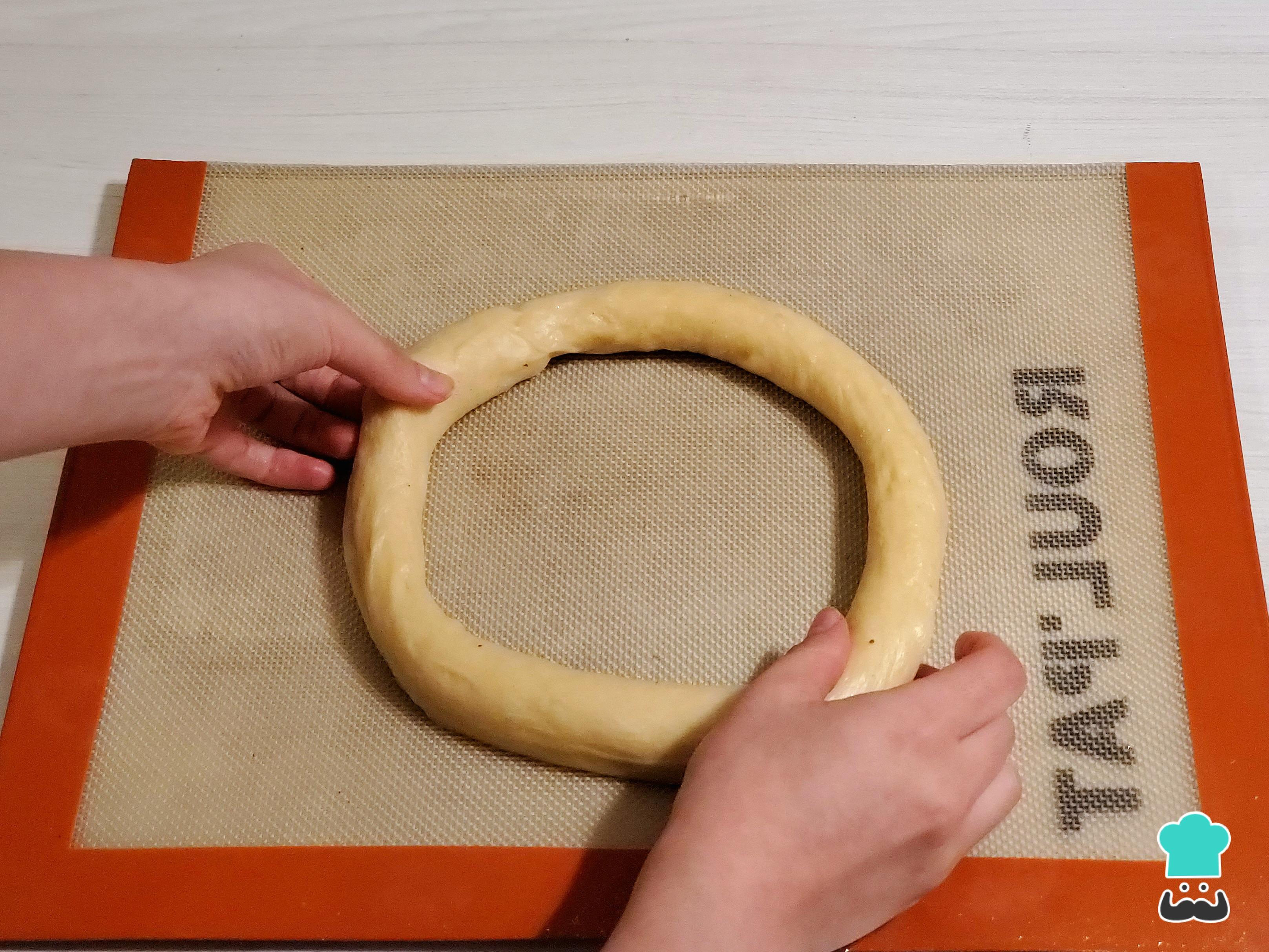 Coloca la tira de masa del roscón de Reyes casero sin azúcar en forma circular sobre una placa con tapete de silicona o previamente engrasada y deja que fermenta una vez más hasta que duplique su volumen.