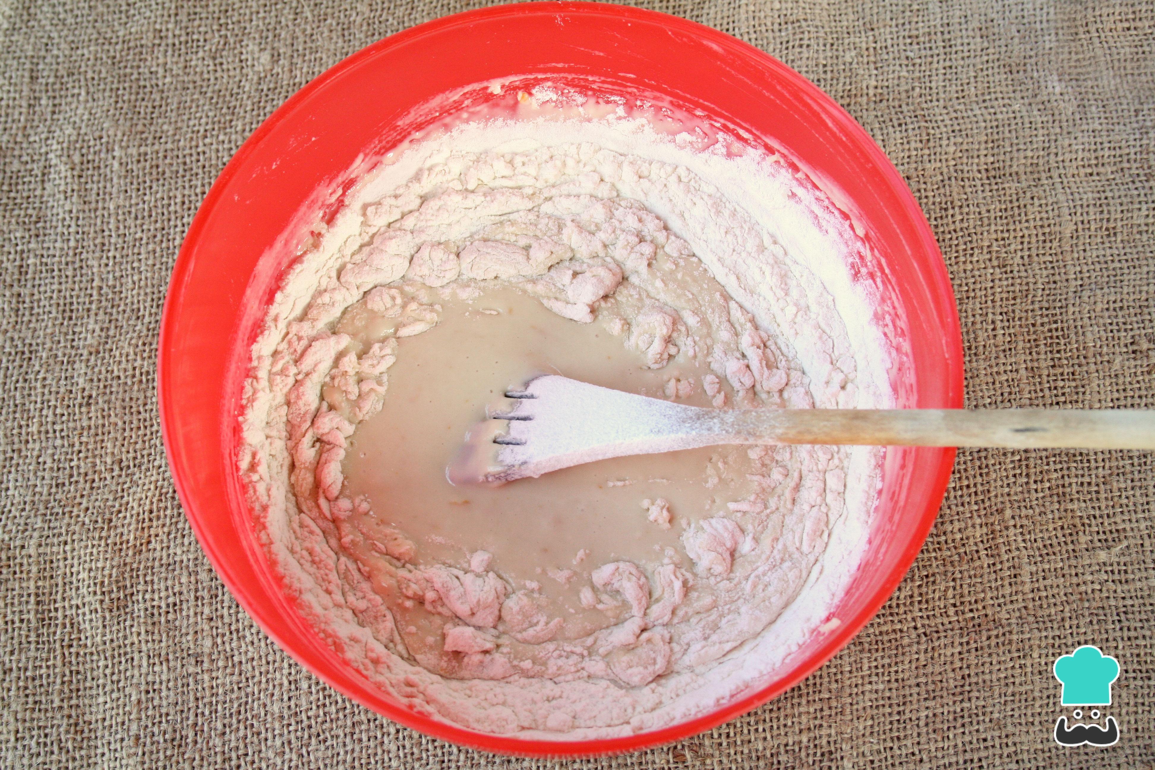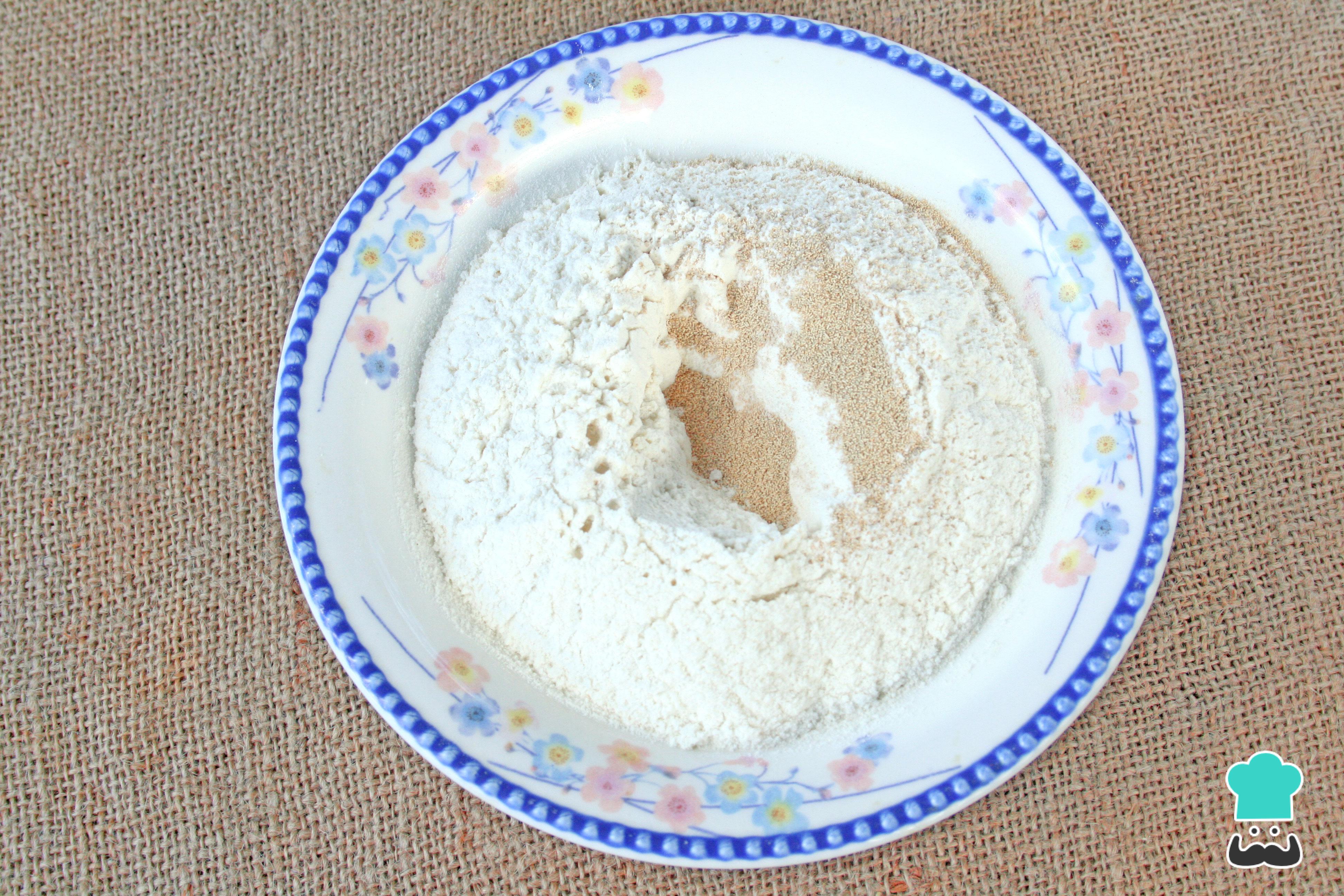 Por otra parte, tamiza los ingredientes secos: la harina, la sal y la levadura. Mezcla muy bien hasta que se integren por completo.
