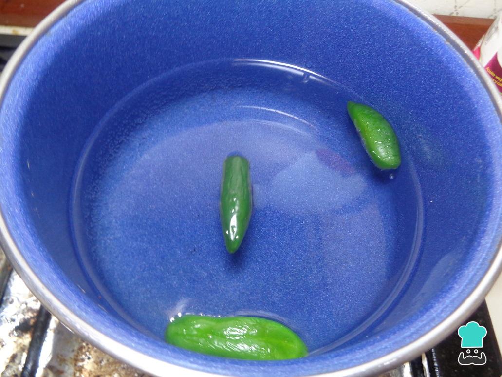 Para comenzar con las salchicha en jitomate, vamos a colocar los chiles serranos en una cacerola con agua hirviendo esto con la finalidad de que se cuezan, primero colocamos los chiles ya que estos tardan un poco mas en cocerse. Aproximadamente 10 minutos antes de colocar los demás ingredientes para el caldillo.