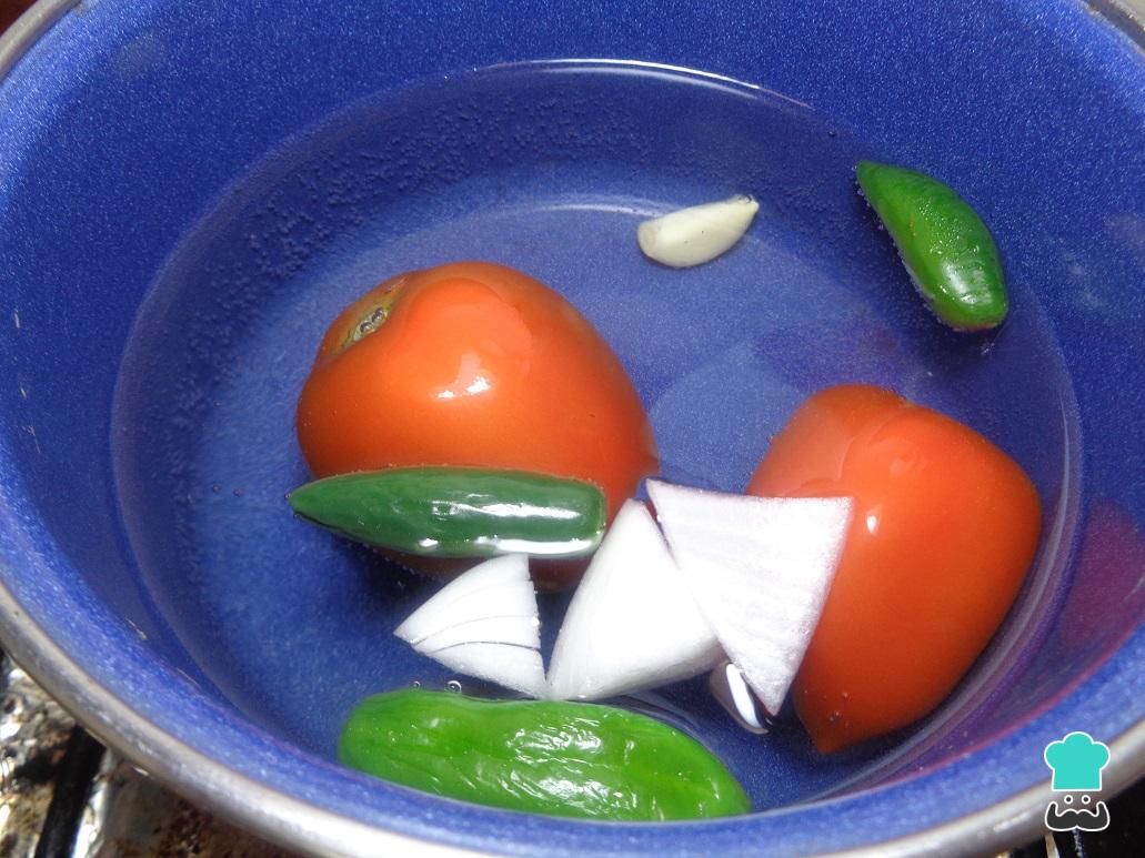Una vez avanzada la cocción de los chiles serranos, añadimos al agua hirviendo los tomates rojos, la cebolla y el ajo, dejamos que se cocinen por 5 minutos más a fuego alto.