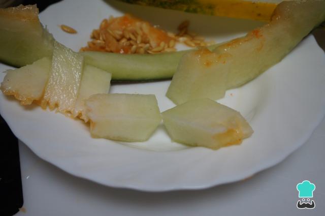 Para empezar con la receta de salmorejo de melón, primero debes escoger un melón maduro, este proporcionará más sabor al salmorejo. A continuación, córtalo en tiras, retira la corteza y también las pepitas. Córtalo en trozos y reserva.